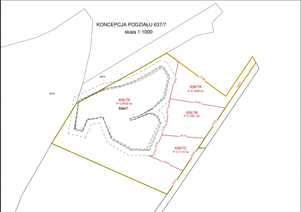 Logiczny układ parceli: 2 numery ewid. (636/7 – 1,3842 ha i 636/10 – 0,1746 ha) → możliwość prostego podziału na 3 × ≈ 5 000 m².
