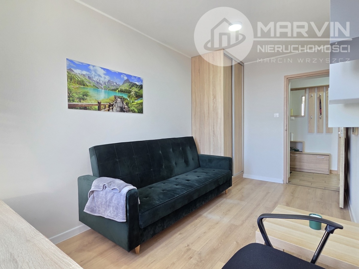 Duży pokój (18m2 + balkon) – wygodna rozkładana kanapa, duża szafa, biurko z krzesłem, balkon.