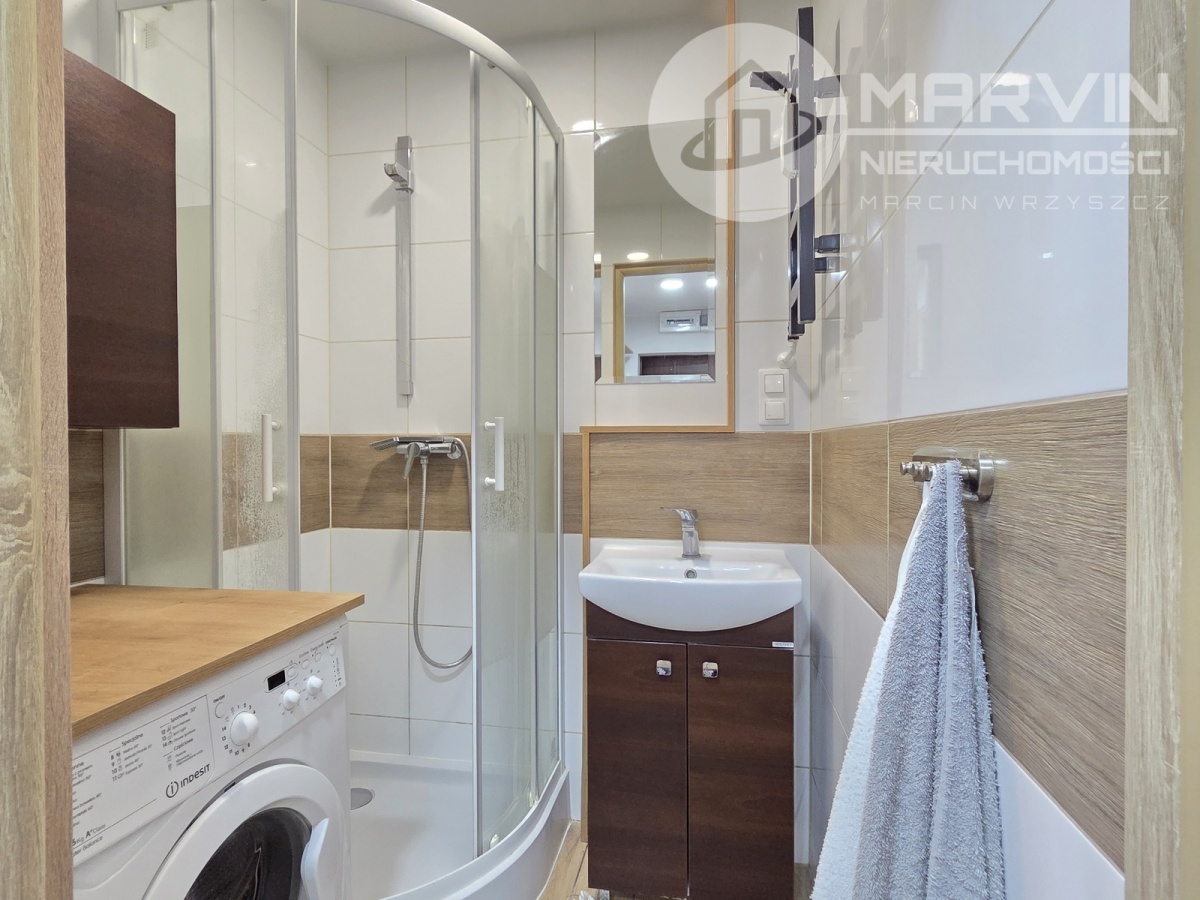 Łazienka 1 – kabina prysznicowa, pralka, umywalka, szafka z lustrem, lustro, regał.