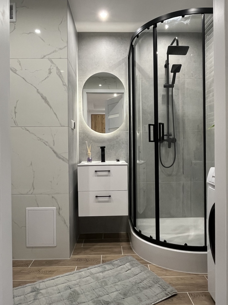 – Nowe meble na wymiar od stolarza (kuchnia, przedpokój, szafka z umywalką w łazience)