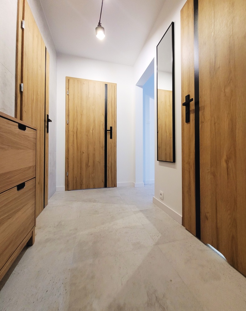 Mieszkanie przeszło kapitalny remont, w którym zastosowano wysokiej jakości materiały, podłogi gres i drewno.