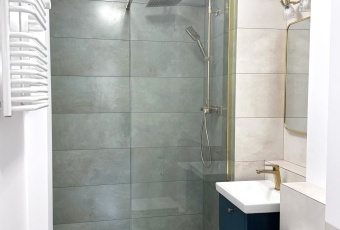 – Łazienka z elegancką kabiną prysznicową, nowoczesną armaturą i praktycznymi rozwiązaniami.