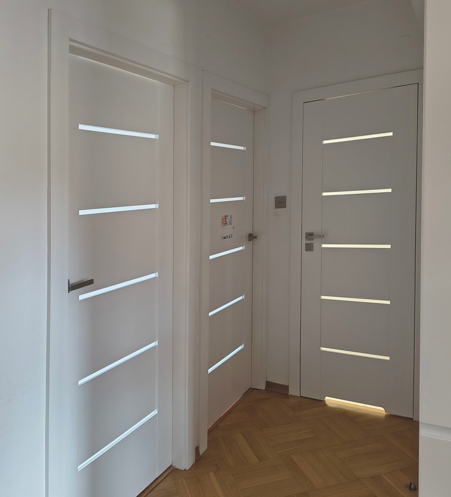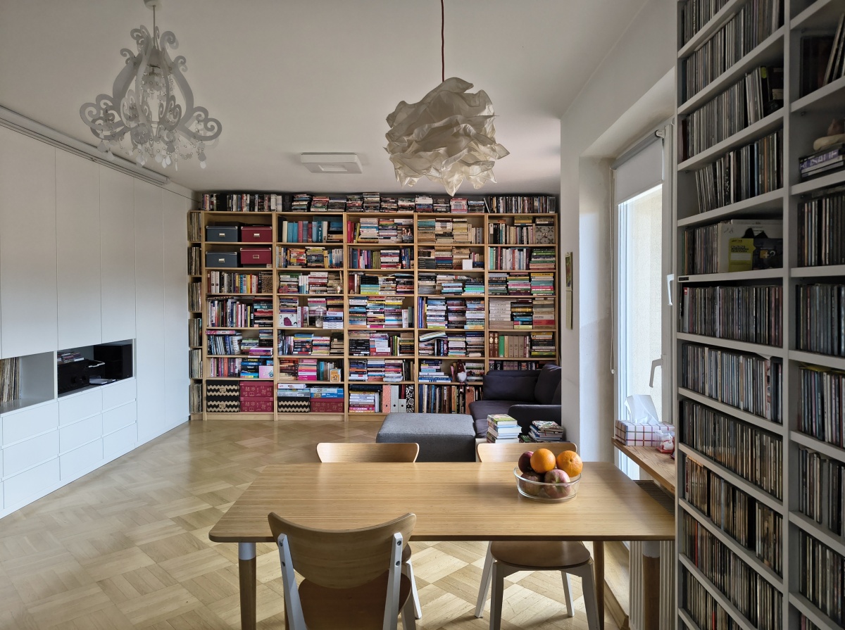 Salon z otwartą kuchnią (ok. 40 m²): Duża, bardzo jasna przestrzeń z wyjściem na balkon (ok. 9 m²) od strony patio. Na podłodze parkiet dębowy, w kuchni żywica epoksydowa.