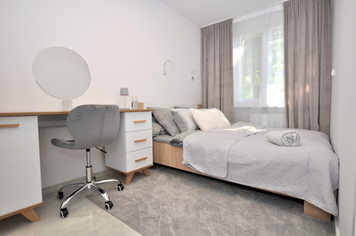 – Sypialnia – komfortowe łóżko małżeńskie z wysokiej klasy materacem, pojemna szafa z lustrem, miejsce do pracy/nauki