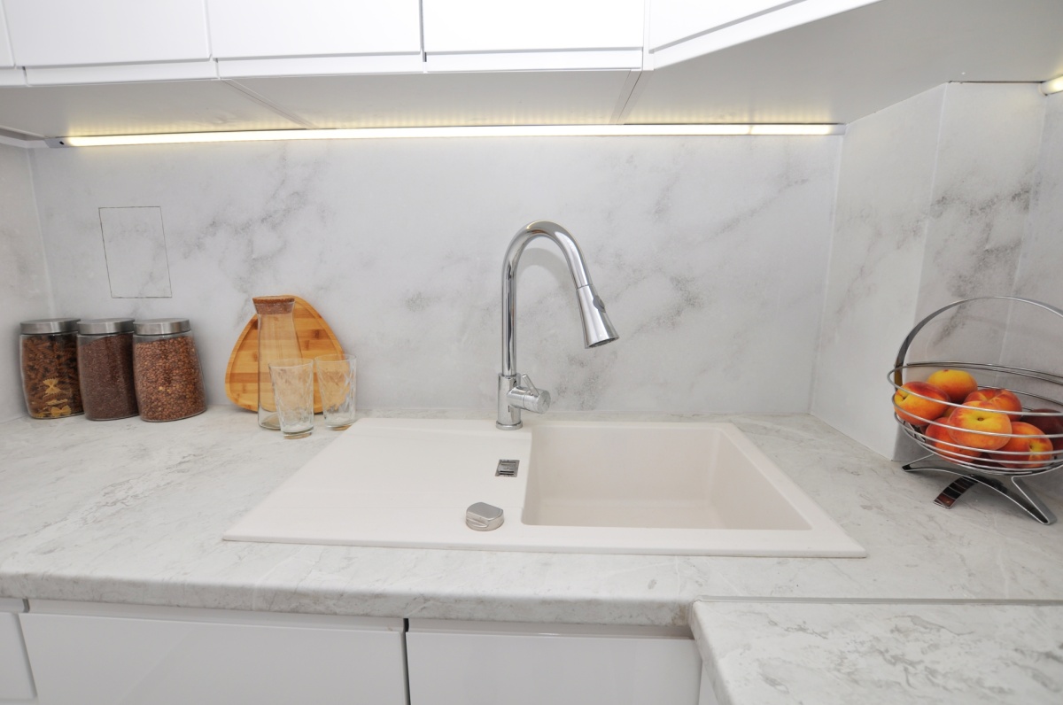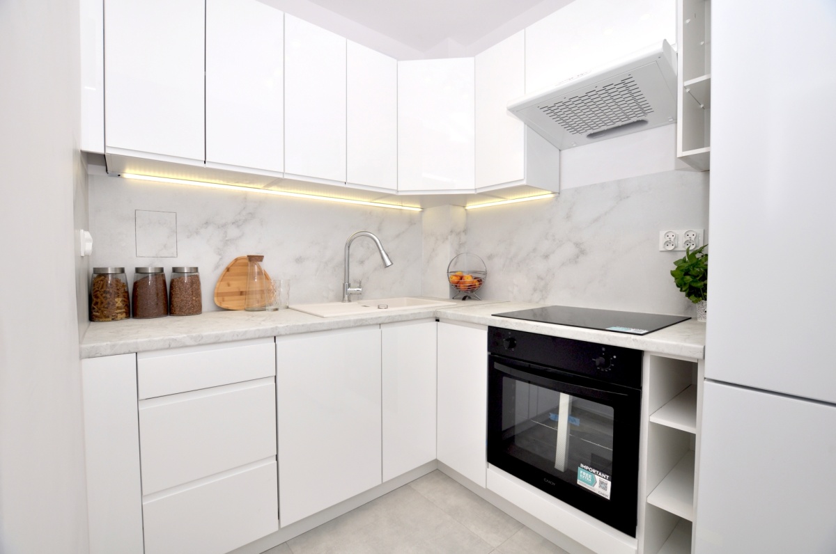 – Kuchnia – w pełni wyposażona, nowoczesne meble na wymiar oraz sprzęt AGD renomowanych marek (piekarnik, płyta indukcyjna, zmywarka, lodówka-zamrażarka), oświetlenie LED nad blatem