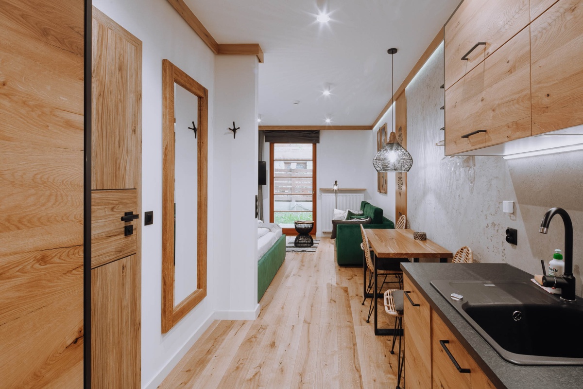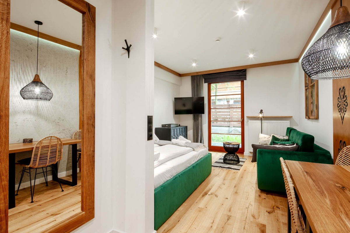 Apartament inwestycyjny zlokalizowany w bliskim sąsiedztwie kompleksu skoczni narciarskich, terenów rekreacyjnych, atrakcji turystycznych, ale także słynnych Krupówek, które znajdują się w odległości ok. 800m od budynku! Jest to świetne miejsce zarówno dla osób, które chcą korzystać z bliskości centrum i uroków miasta, jak i tych dla których najważniejsza jest bliskość szlaków turystycznych i bazy wypadowej dla górskich wędrówek po Tatrach. Apartament zlokalizowany w budynku w którym znajduje się STREFA SPA z saunami i jacuzzi, a także duży zewnętrzny parking. W samym budynku jest winda.