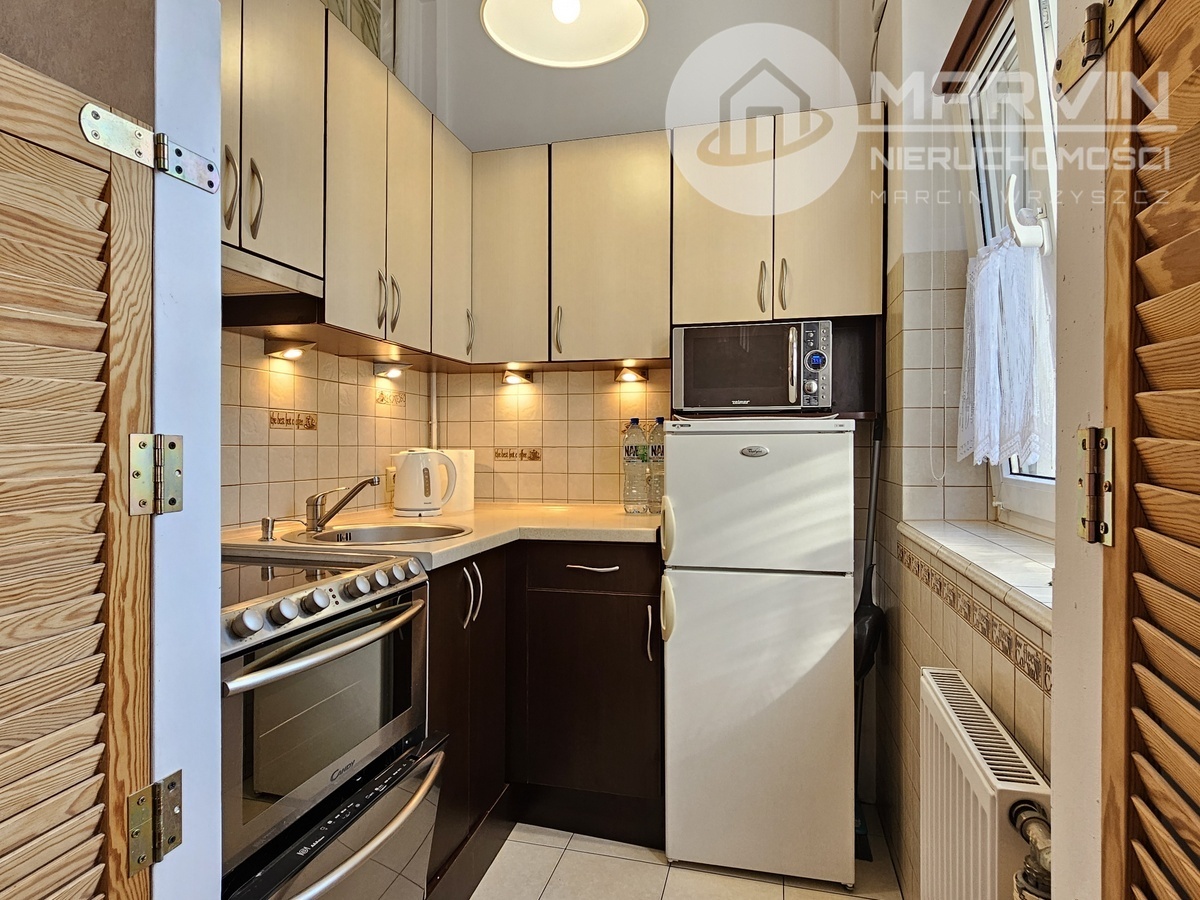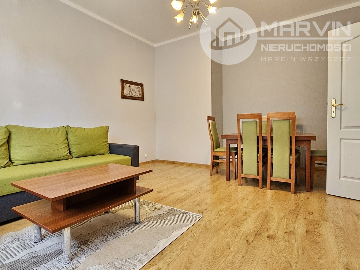 Na 44m2 składają się: umeblowany salon, pokój z wejściem do wyposażonej kuchni, wyposażona łazienka i korytarz z wieloma szafami.