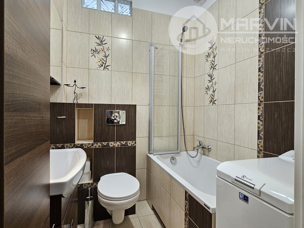 Łazienka – wanna z prysznicem, pralka, szafka z lustrem, zabudowa łazienkowa.