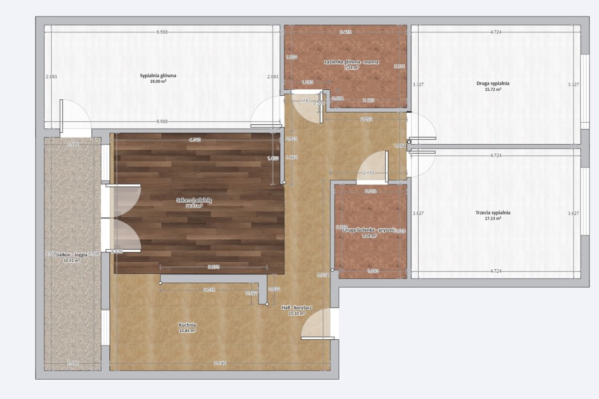 3 sypialnie, 2 łazienki, duży balkon typu loggia.