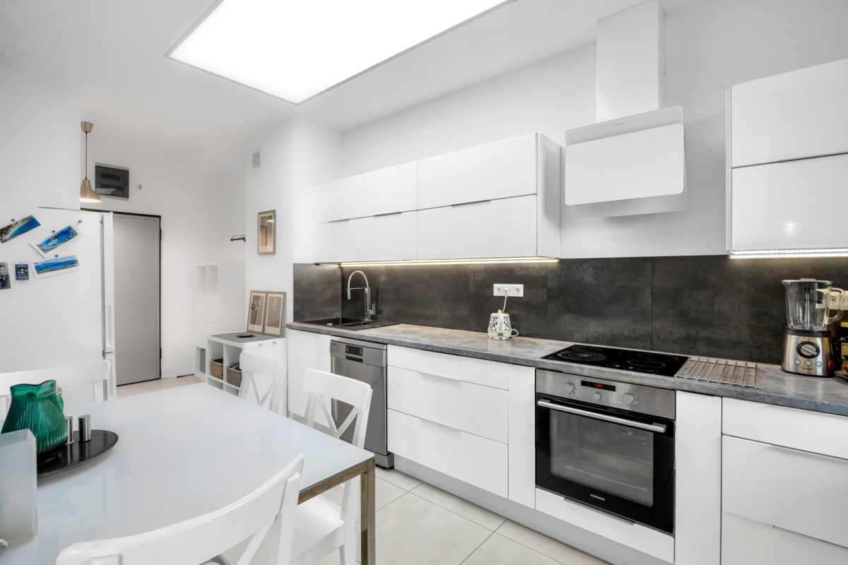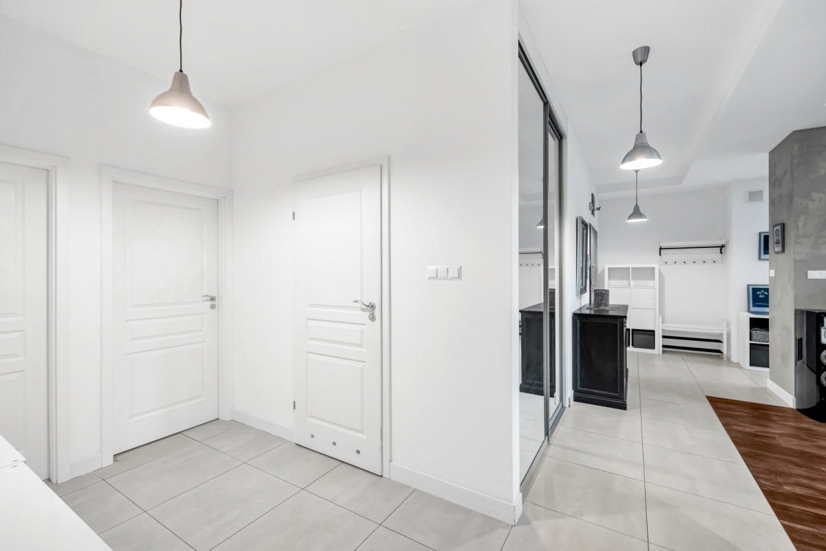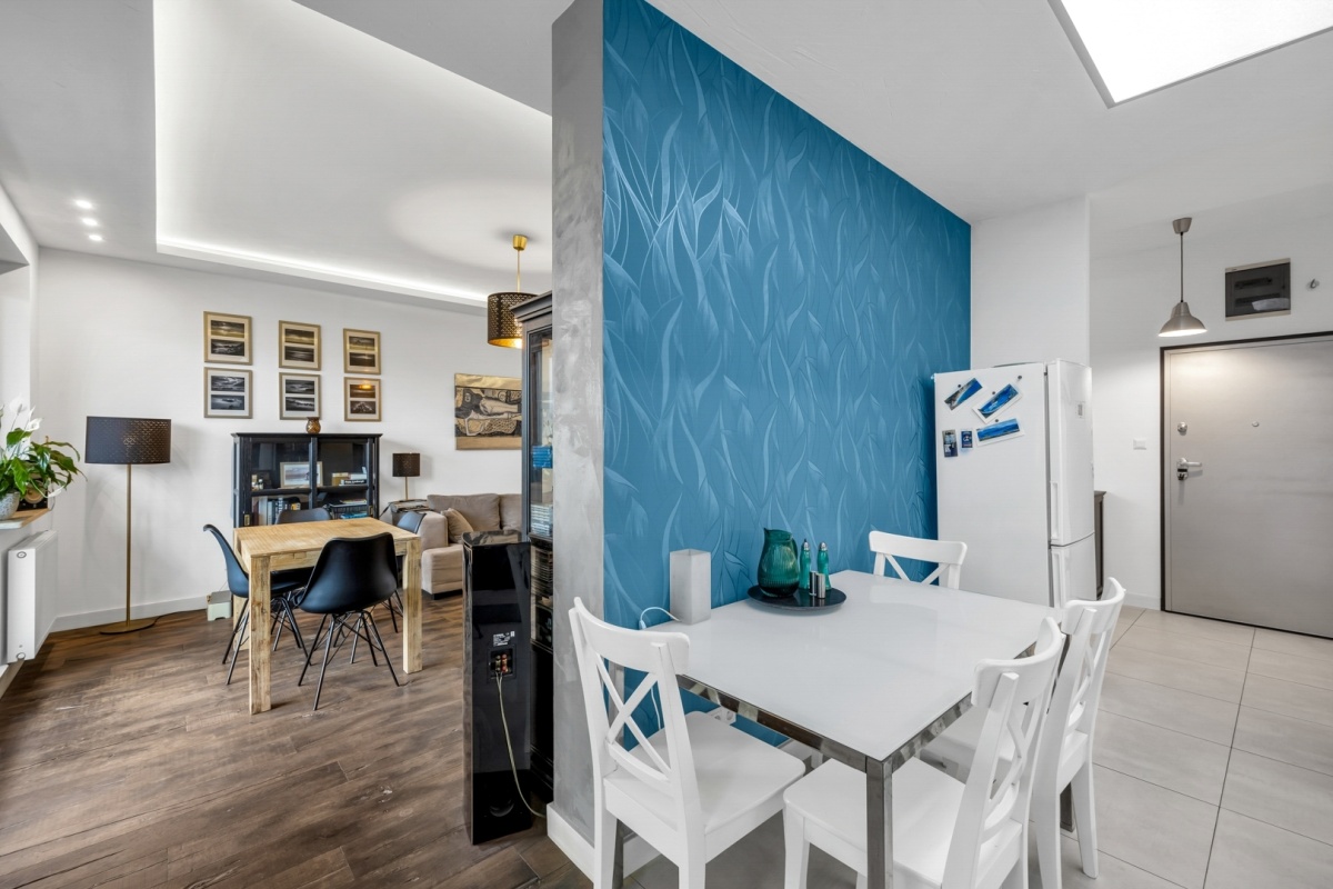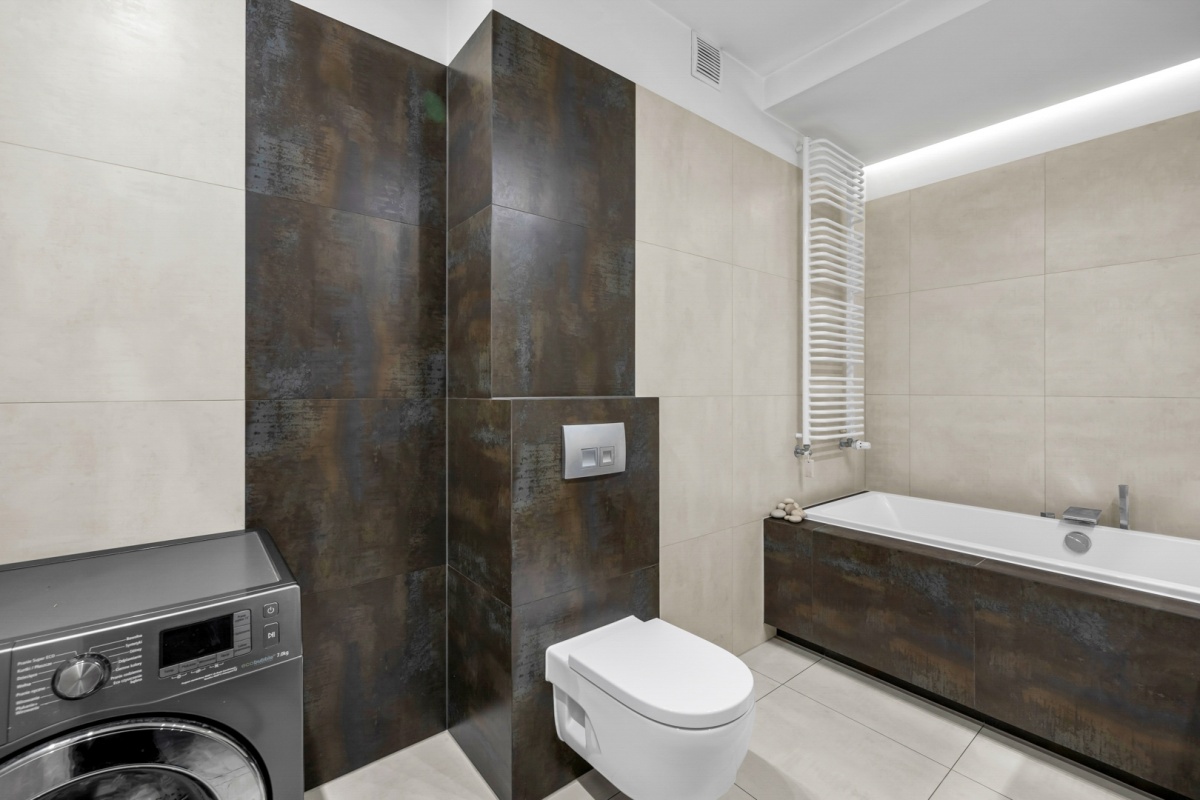 Projekt mieszkania został zoptymalizowany – powiększono łazienki i otwarto przestrzeń między kuchnią a salonem. Starannie zaprojektowana przestrzeń zapewnia dużą funkcjonalność i wygodę.