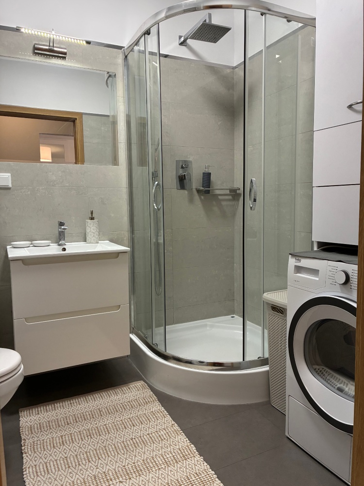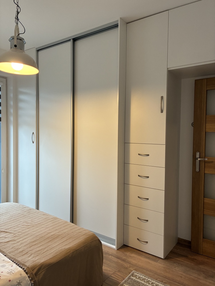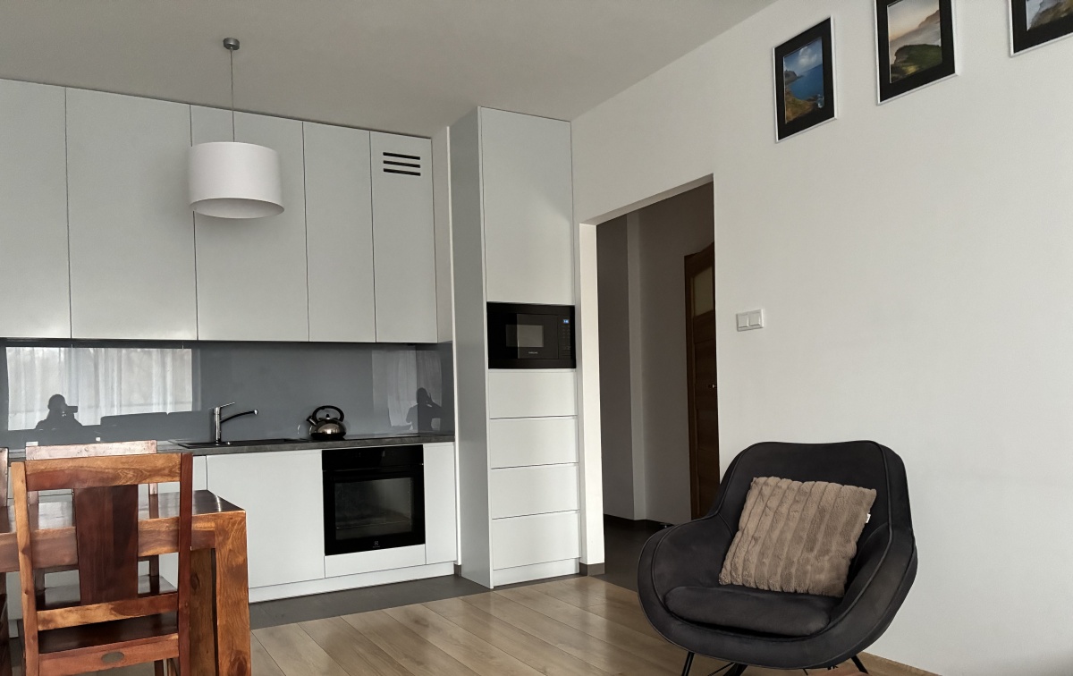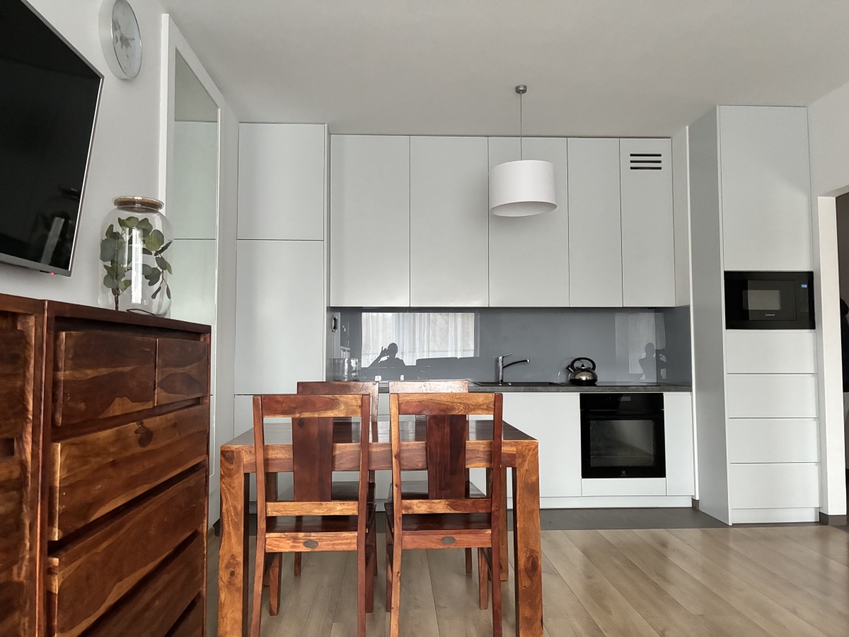 – The apartment is fully furnished and was designed for the owner’s own use, with great attention to the quality of materials and functionality of the space. Custom-made furniture maximizes the usable area. New kitchen furniture, high-class household AGD, wooden furniture (table, chairs), additionally a sofa, armchair, chests of drawers, and TV. The bathroom features a new shower, washing machine, and automatic dryer. The bedroom has a custom-made wardrobe and a new double bed. The apartment is equipped with high-quality air conditioning in both the living room and the bedroom. A large terrace is accessible from both the living room and the bedroom.
