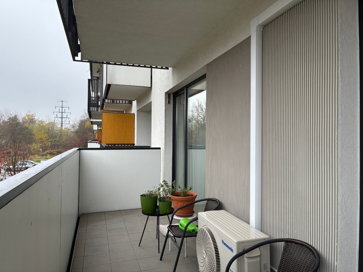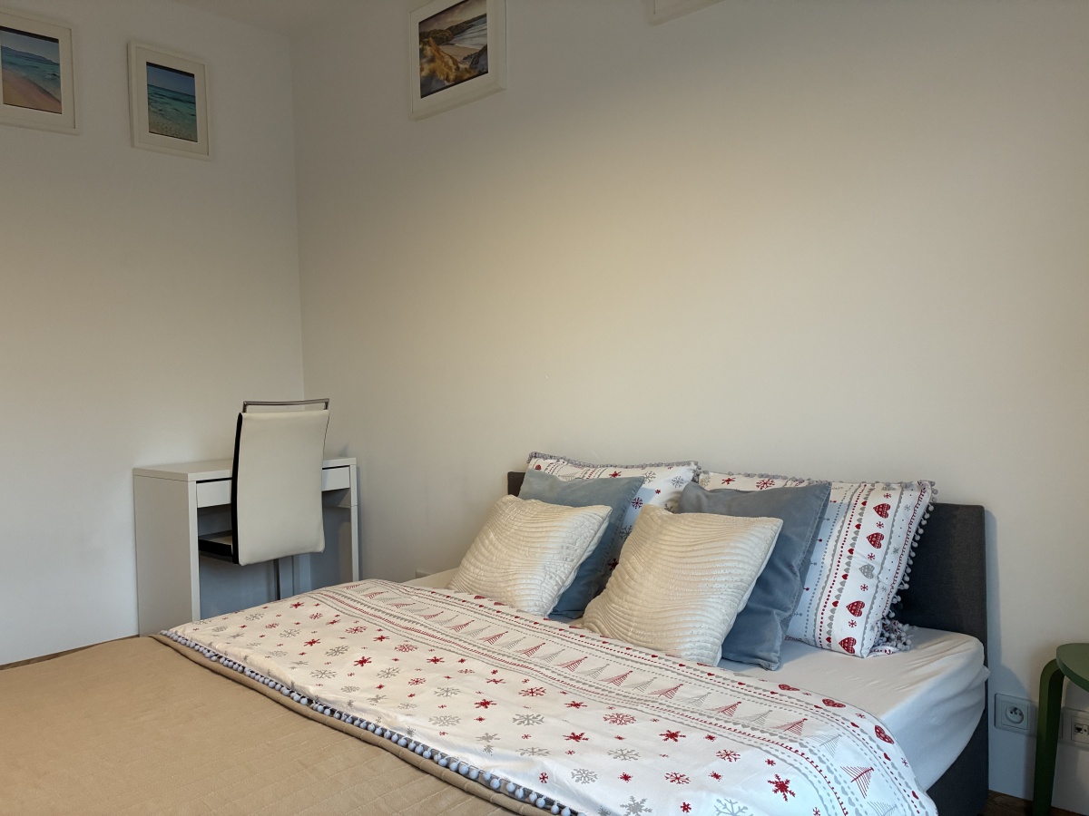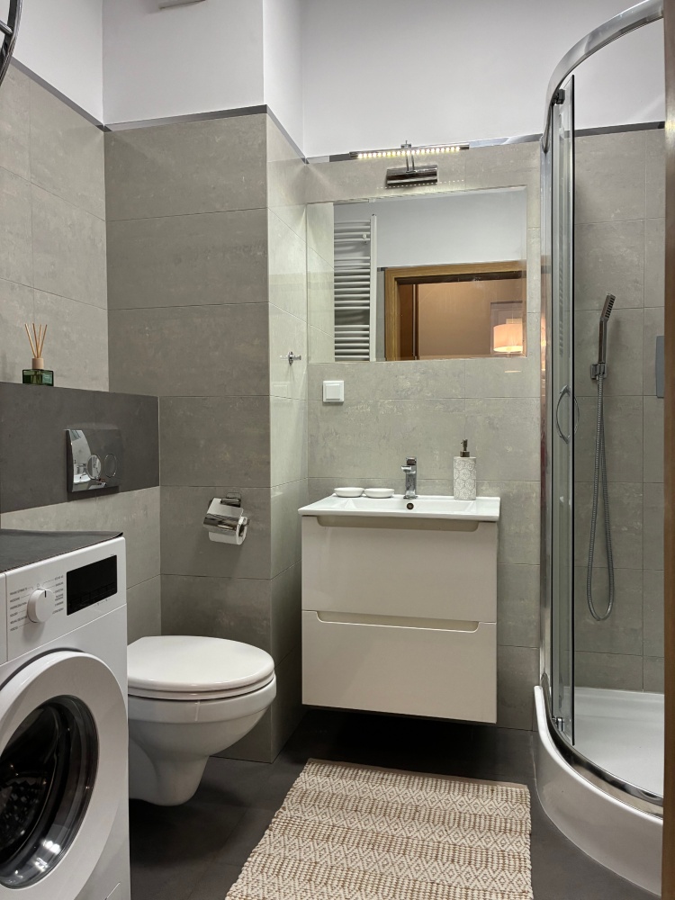 – The apartment is fully furnished and was designed for the owner’s own use, with great attention to the quality of materials and functionality of the space. Custom-made furniture maximizes the usable area. New kitchen furniture, high-class household AGD, wooden furniture (table, chairs), additionally a sofa, armchair, chests of drawers, and TV. The bathroom features a new shower, washing machine, and automatic dryer. The bedroom has a custom-made wardrobe and a new double bed. The apartment is equipped with high-quality air conditioning in both the living room and the bedroom. A large terrace is accessible from both the living room and the bedroom.