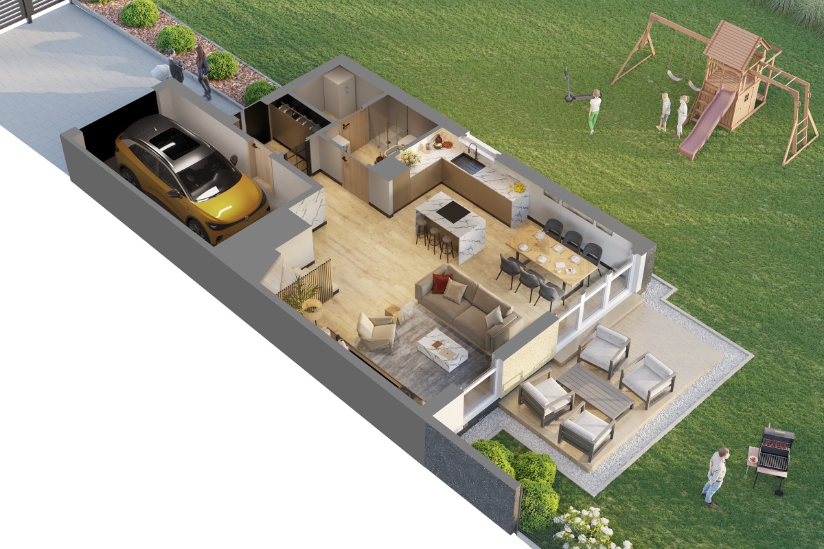 garaż (17,5 m²) z bezpośrednim przejściem do domu – praktyczny w codziennym użytkowaniu.