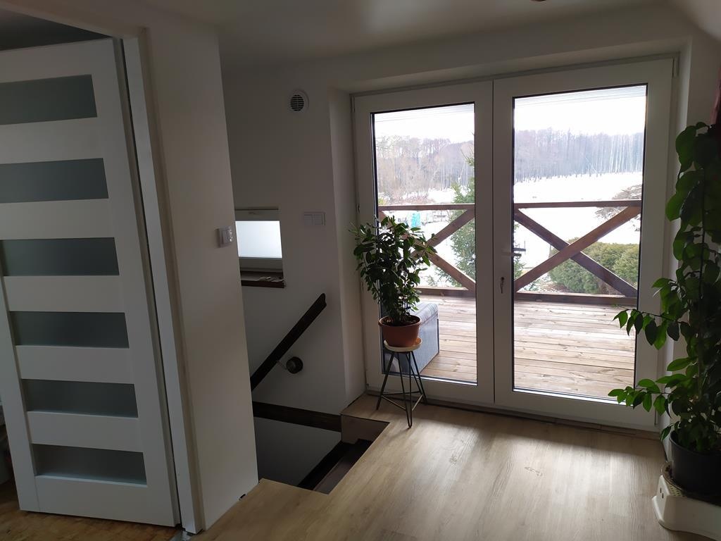 Piętro 43m – Otwarta przestrzeń wypoczynkowa z sypialnią, łazienką 7,2m. z wanną, dużym zadaszonym tarasem 6,8mx2,8m (18m). od południowej strony z widokiem na jezioro i las.