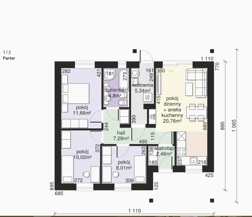 Salon z możliwością kominka i wyjściem tarasowym, kuchnia, jadalnia, 3 sypialnie, łazienka, kotłownia, hol – wg projektu: Dom przy Bukowej 10.