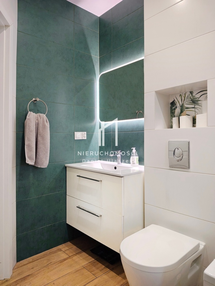 – komfortowa łazienka o powierzchni 8,72m2 wykończona w jasnych barwach z akcentem zielonego dekoru, doskonale zaaranżowana z miejscem na wannę, prysznic, WC i umywalkę,