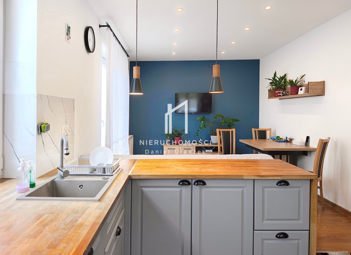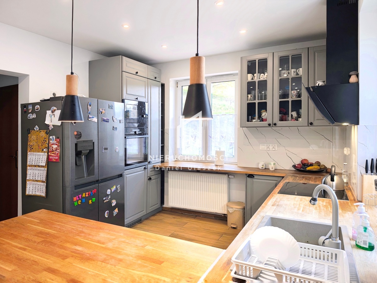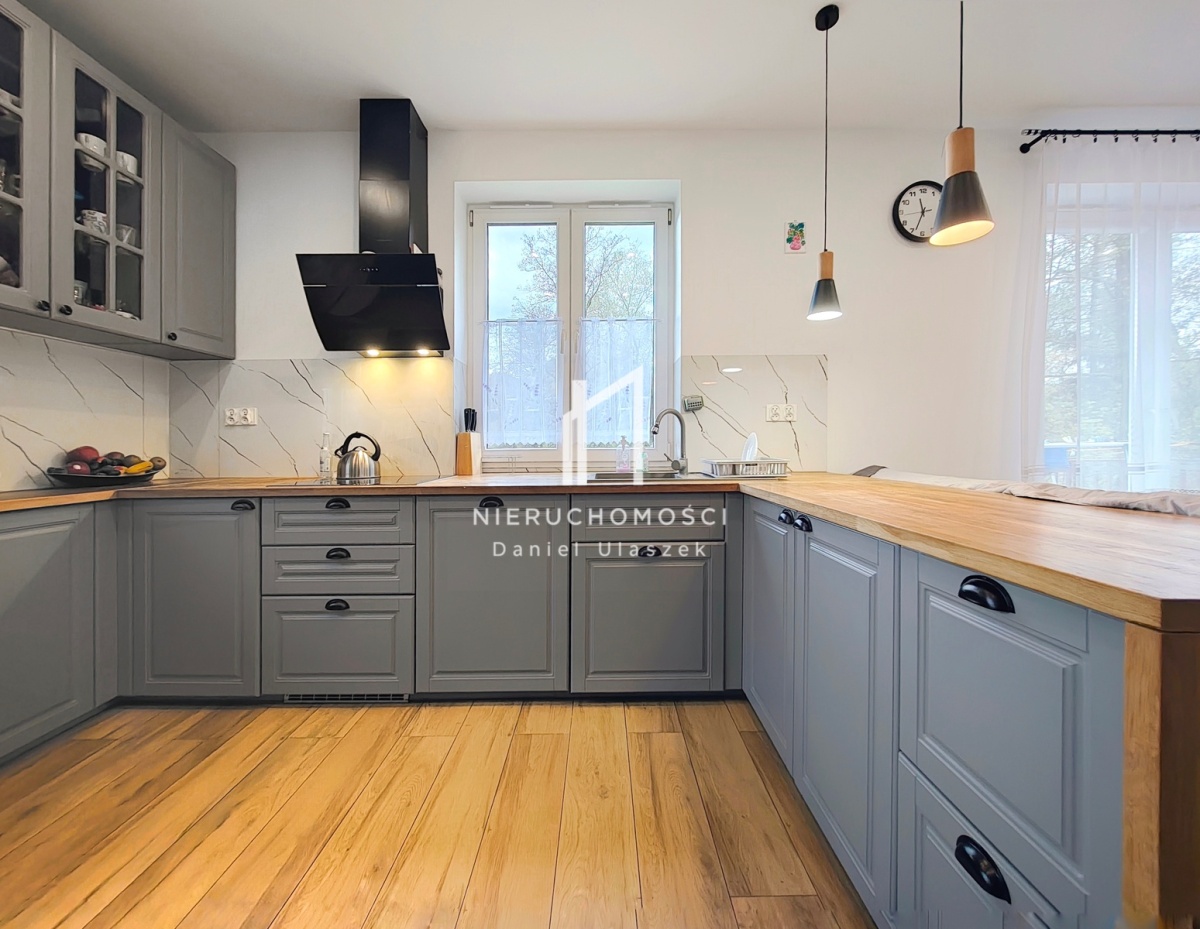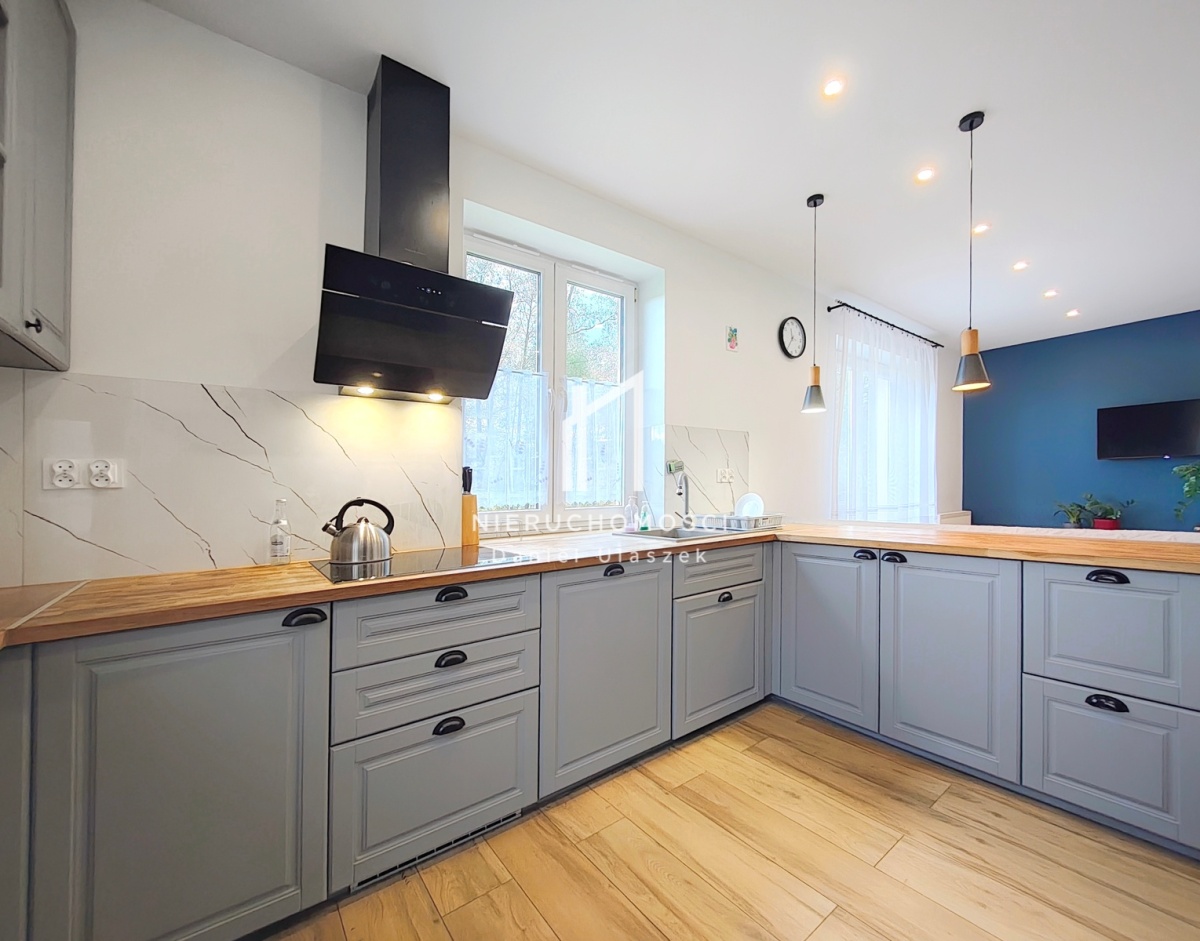 Wnętrze domu zaaranżowane na własny użytek z rzetelnością i starannością. Wykonano podwieszane sufity, gładzie gipsowe na ścianach oraz część mebli na wymiar. W cenie domu stylowe meble kuchenne z drewnianym blatem wraz z osprzętem AGD (płyta indukcyjna, zmywarka, piekarnik, lodówka, pochłaniacz).