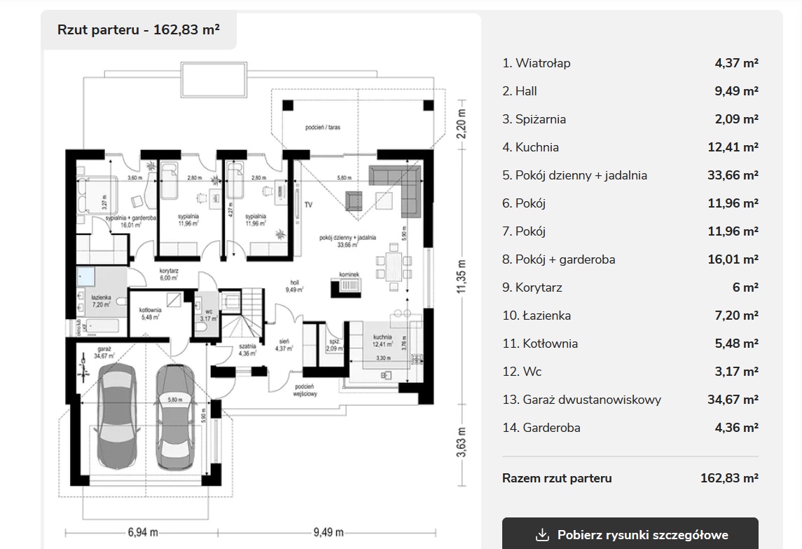 Projekt domu z garażem dwustanowiskowym pracowni MGProjekt z Warszawy. Nazwa "Parterowy 3" adoptowany do wymiarów działki tj. powiększony w części mieszkalnej i garażowej do wym. 1700 x 1110 a garaż 826 x 694 połączony z bryłą budynku.. Pow. b.m. -170 m2 plus poddasze do zagospodarowania a pow. garażu 42 m2 (po obrysie wewnętrznym). Zmieniono usytuowanie wjazdu do garażu na przedłużoną ścianę boczną.
