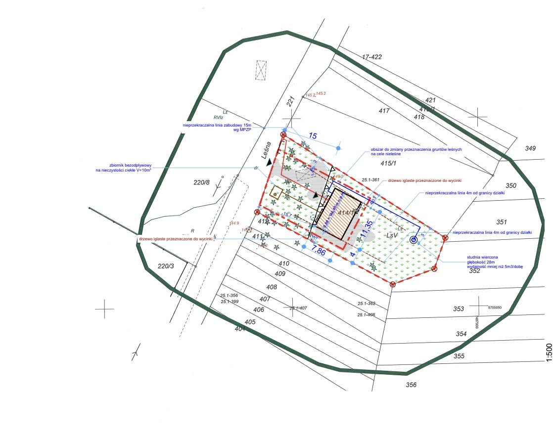 W lipcu 2025 roku wydano pozwolenie na budowę domu jednorodzinnego, którego koncepcja – widoczna na zdjęciu głównym – została indywidualnie zaprojektowana przez architekta specjalnie dla tej działki. Projekt zakłada minimalną ingerencję w naturę, a do rozpoczęcia budowy wystarczy wyciąć zaledwie 3 drzewa, pozostawiając niepowtarzalny klimat leśnego otoczenia.