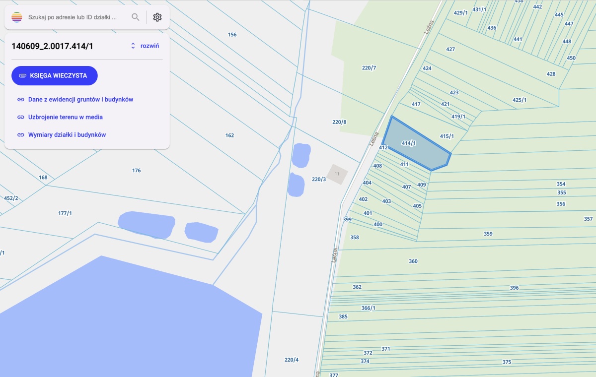Działka otoczona z każdej strony lasem, z dojazdem drogą gminną – jest objęta miejscowym planem zagospodarowania przestrzennego, który zezwala na budowę domu jednorodzinnego.