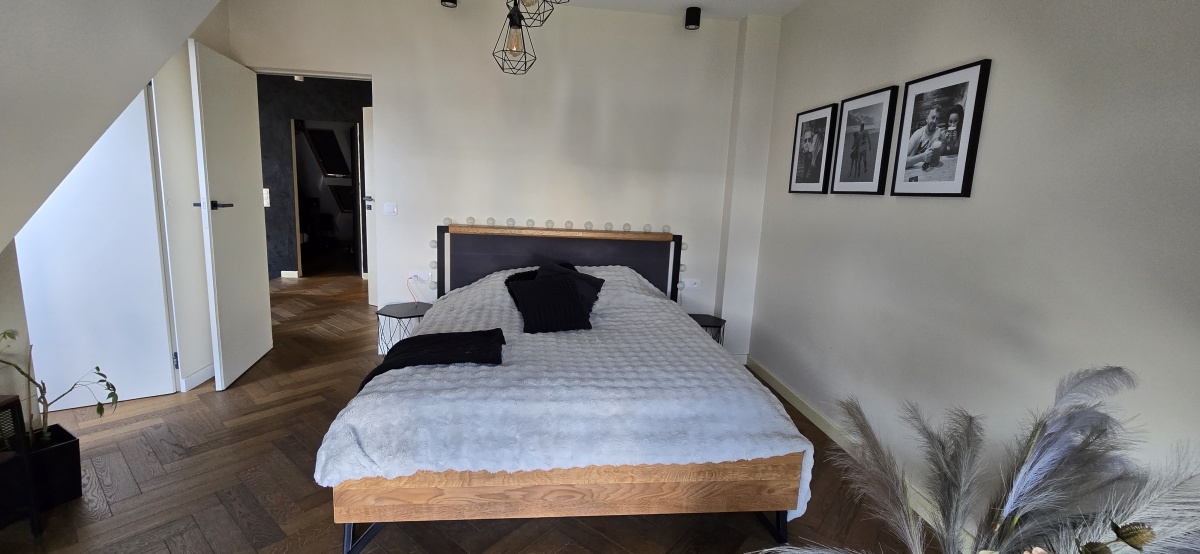 Sypialnia główna z przestronną garderobą tworzy komfortową, spójną strefę właścicieli.