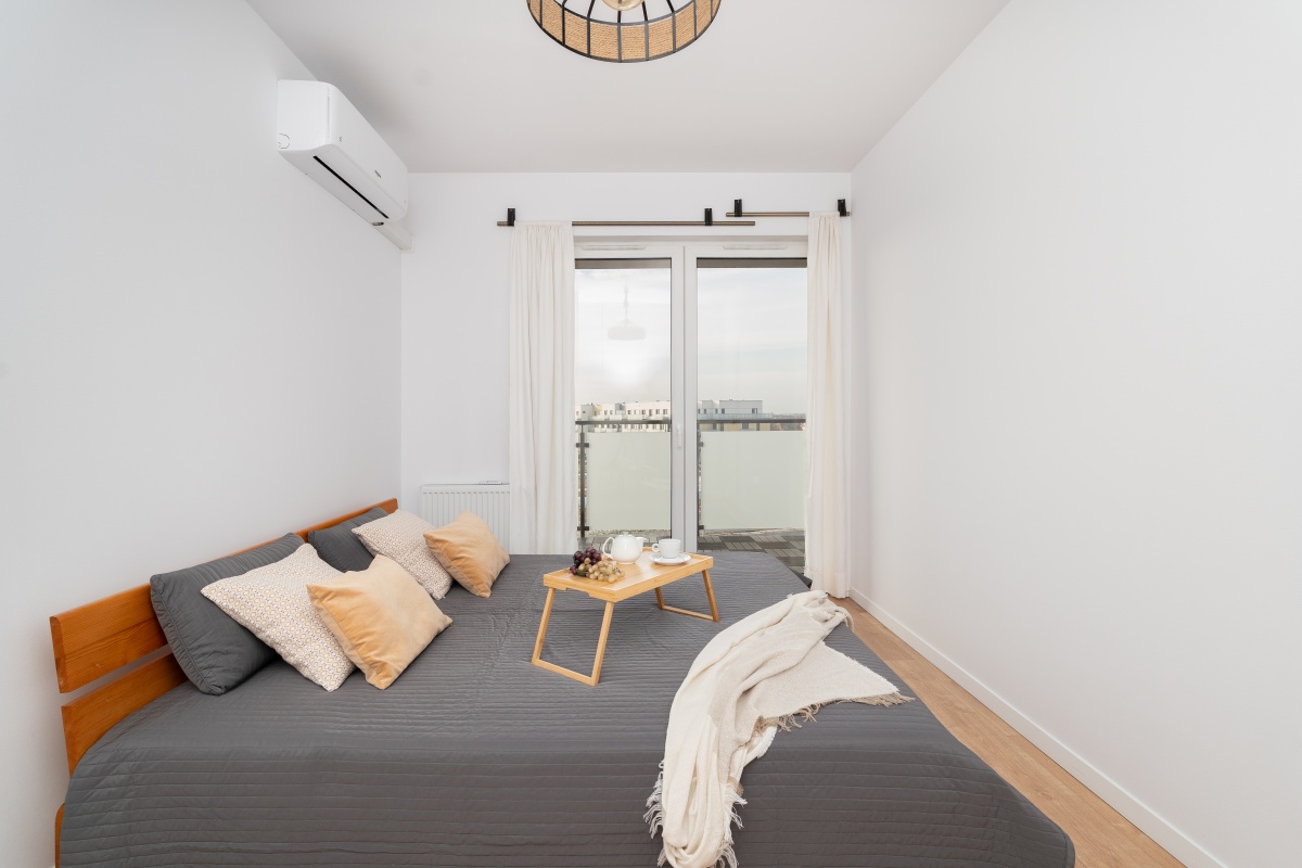 Z sypialni mamy bezpośrednie wyjście na duży przeszklony balkon.