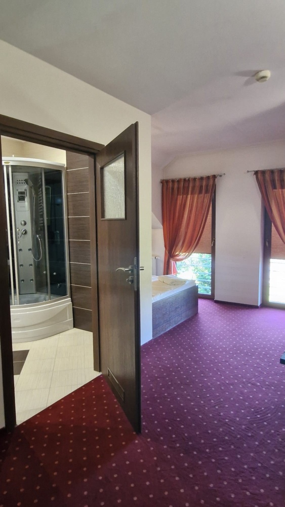 • Piętro: 18 pokoi dwuosobowych, sala konferencyjna, biuro, dwa tarasy