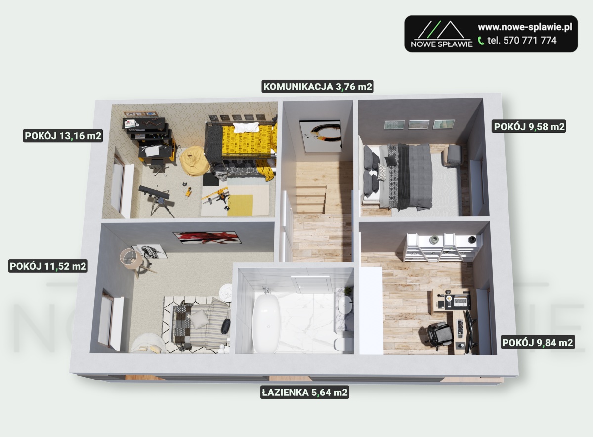 • 4 sypialnie: 13,28 m², 11,46 m², 9,92 m², 9,70 m²