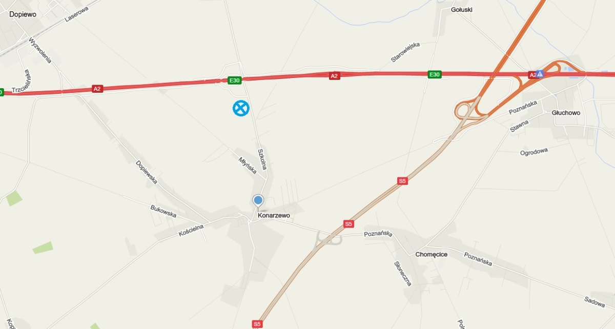 Grunt inwestycyjny zlokalizowany w Konarzewie przy ul. Szkolnej – droga asfaltowa, przy autostradzie A2, tylko 3 km od czynnego już węzła Konarzewo.