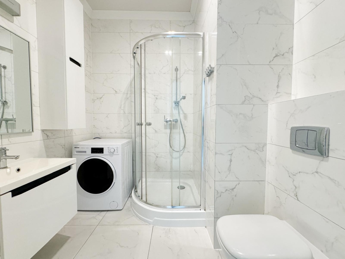 łazienka wykończona z wysokiej jakości ceramiki i armatury, m.in kabina prysznicowa, pralko-suszarka.