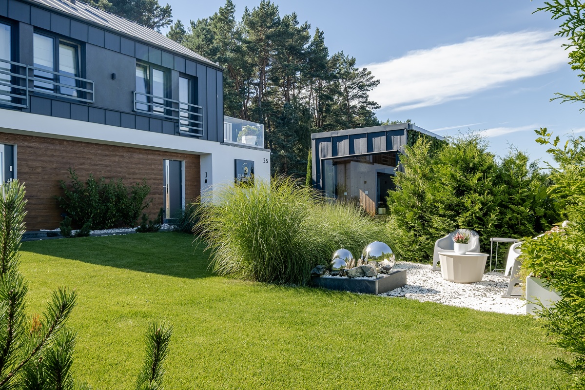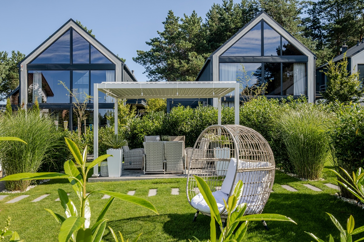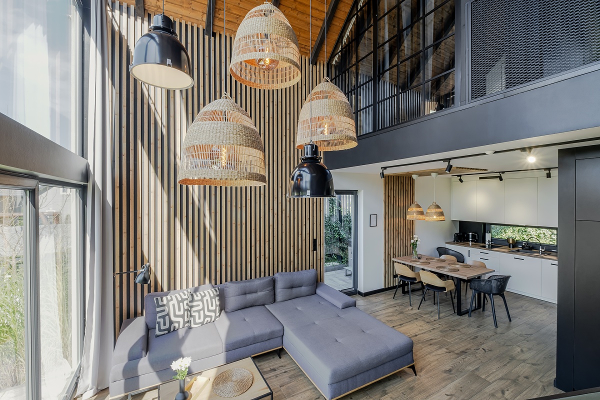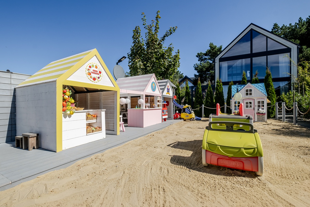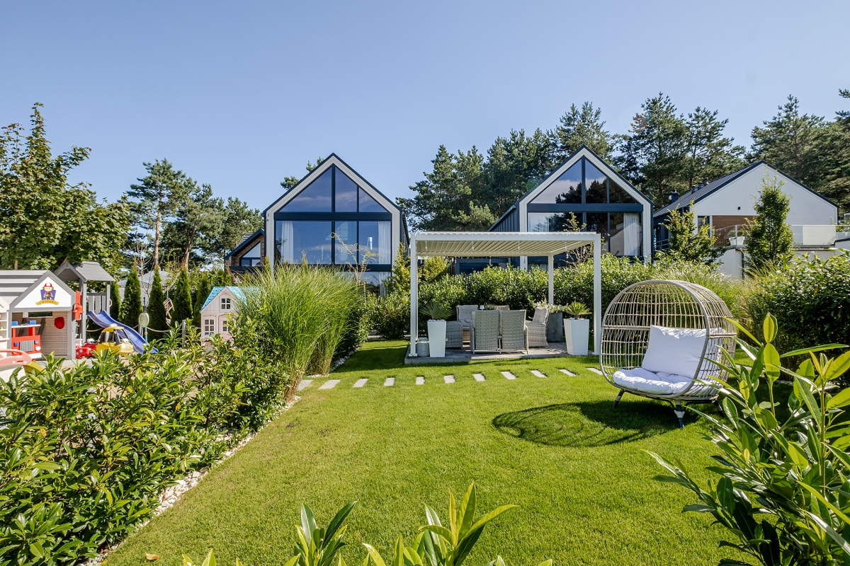 Wnętrza zaprojektowane a następnie wykończone z najwyższą starannością. Domki zostały urządzone w różnych stylach – glamour, prowansalskim, hampton lub loftowym, co sprawia, że każdy Gość znajdzie coś dla siebie. Meble kuchenne, łazienkowe i schody wykonane na zamówienie przez lokalnych stolarzy. Dołączamy pościel hotelową, ręczniki z logo obiektu.