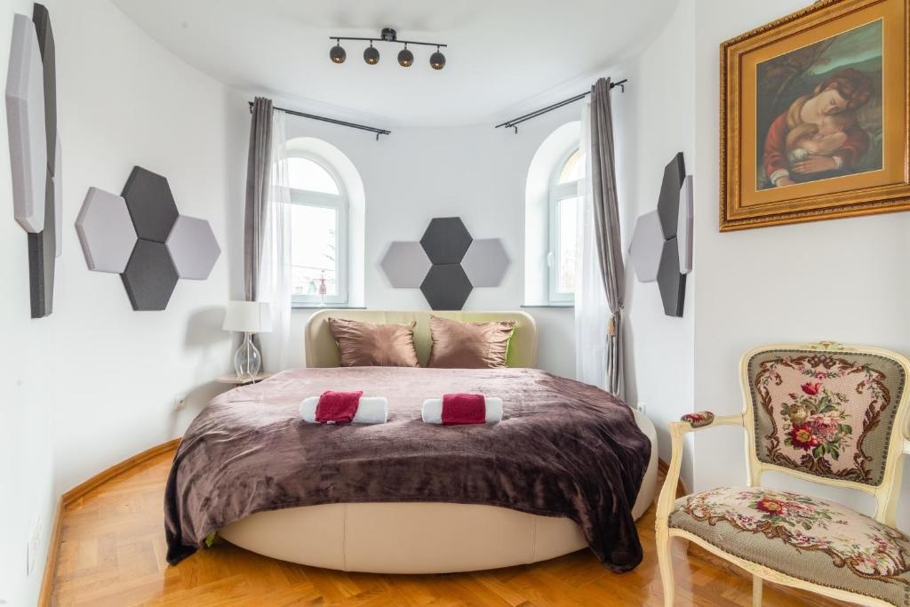 wygodnymi łóżkami kontynentalnymi lub okrągłymi łóżkami queen o średnicy ponad 2,5 m,