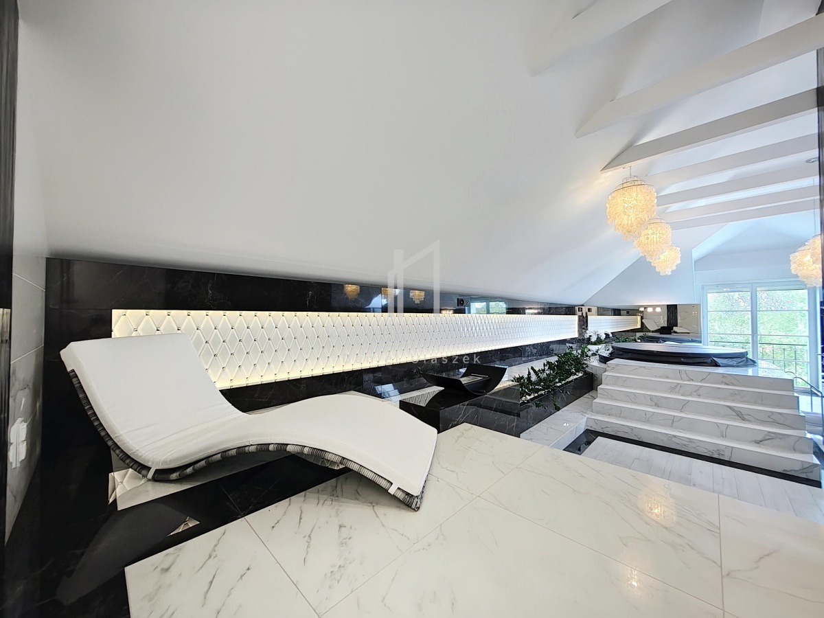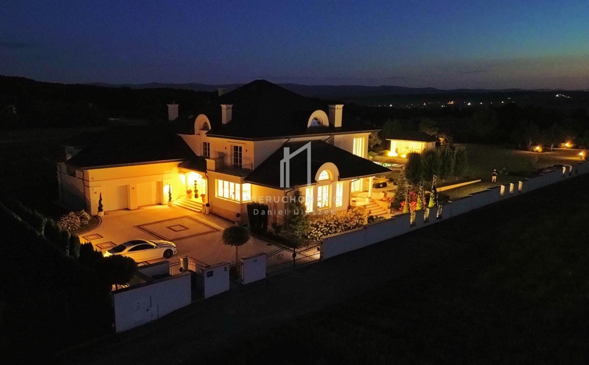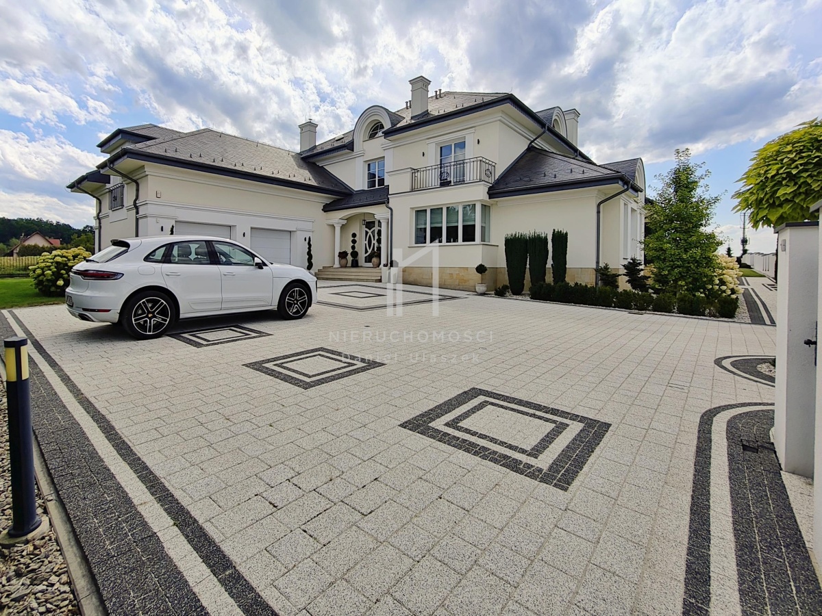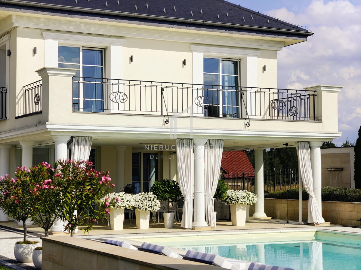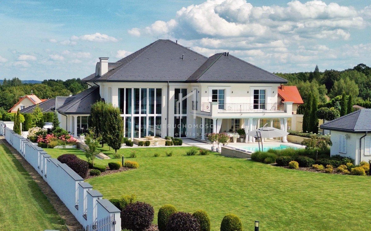 Okazała willa o powierzchni zabudowy 499 m² położona jest na działce liczącej 3382 m² (~34 arów), posesja otoczona pięknie zagospodarowanym ogrodem. Całość dopełnia reprezentacyjny, panoramiczny taras wraz z basenem o powierzchni ok. 236m² i pawilonem odpoczynkowym. Dom oferując nowoczesne rozwiązania technologiczne oraz luksusowe wykończenia z najwyższej jakości materiałów sprowadzonych głównie z Włoch i Niemiec.