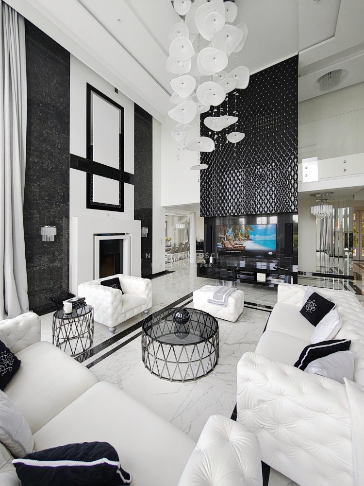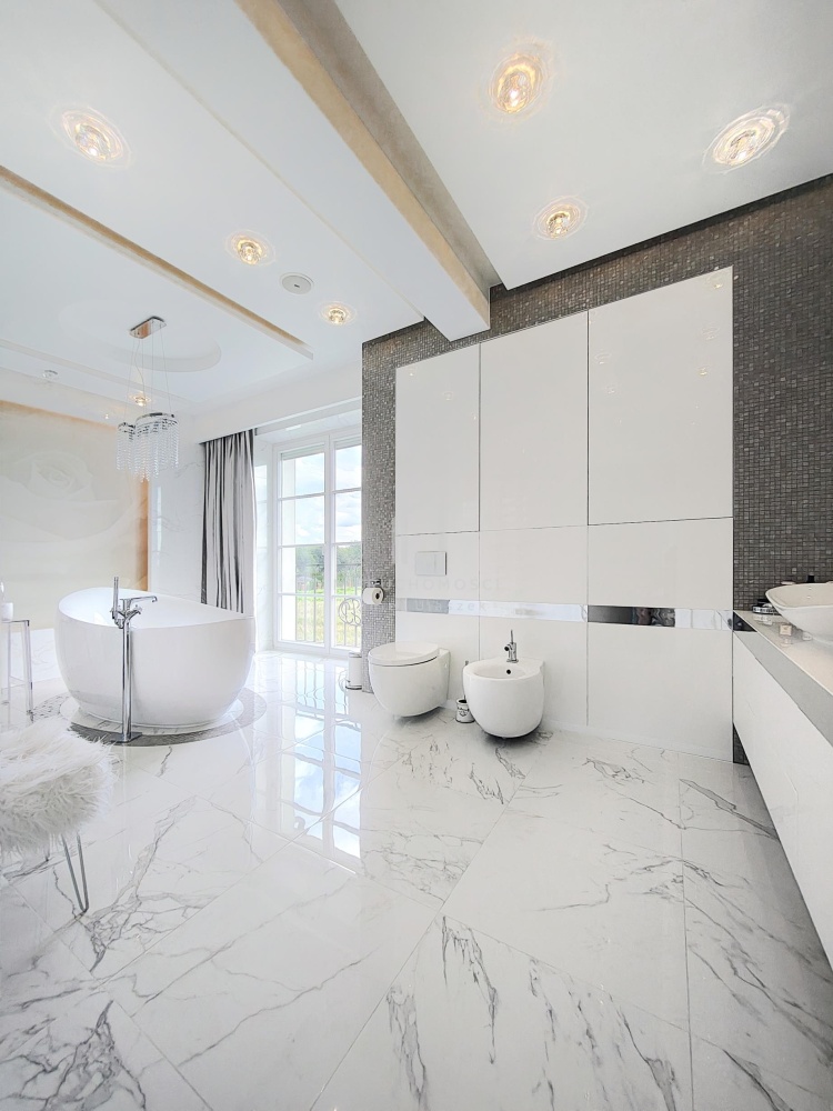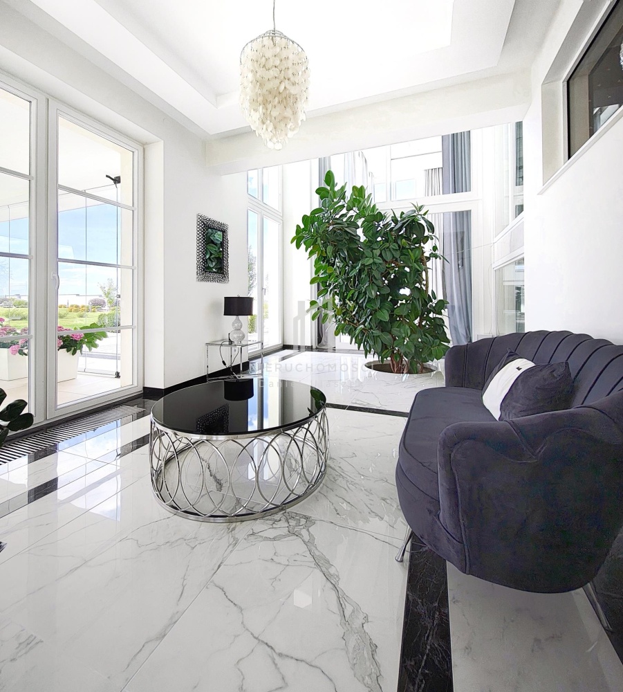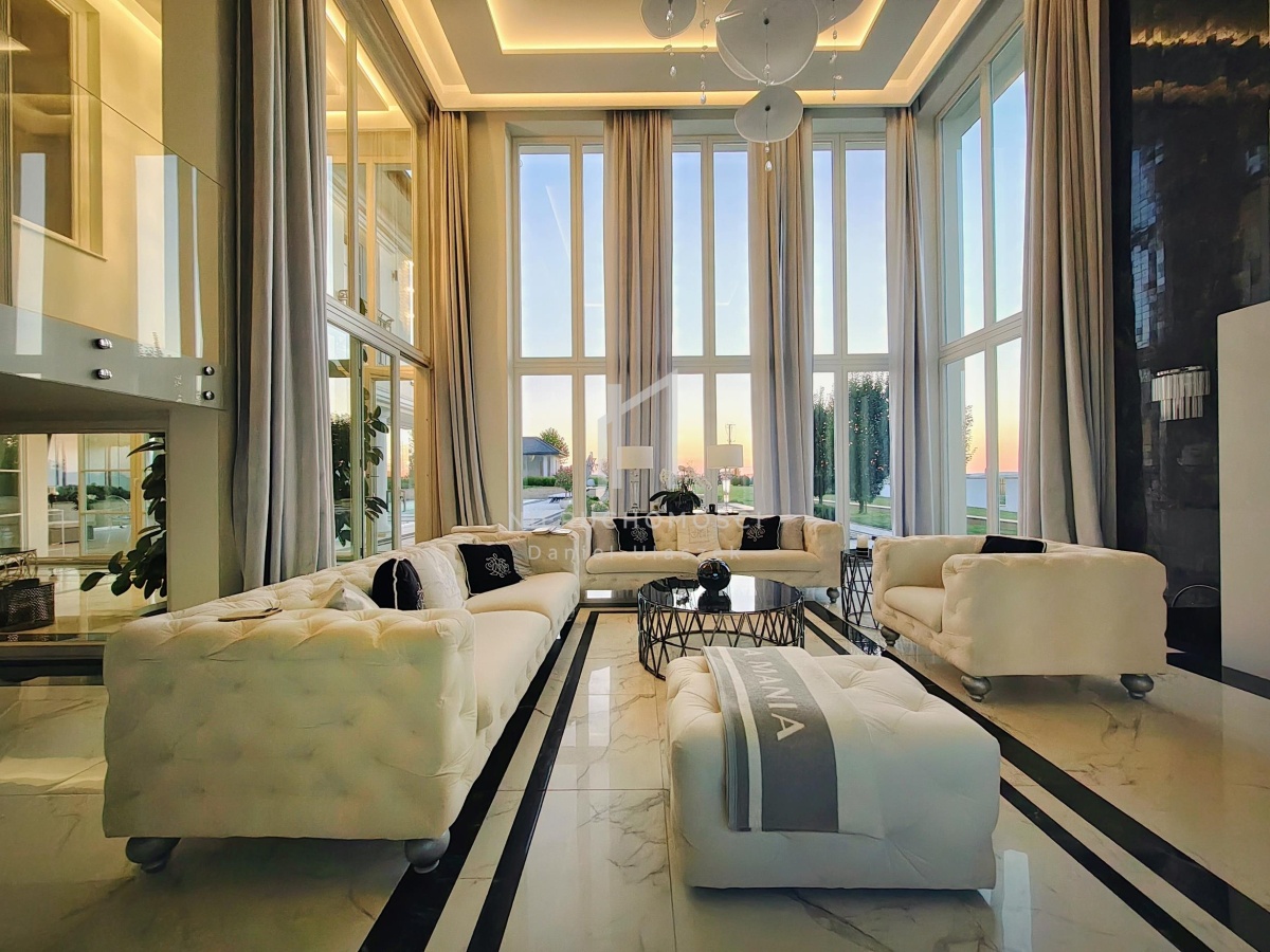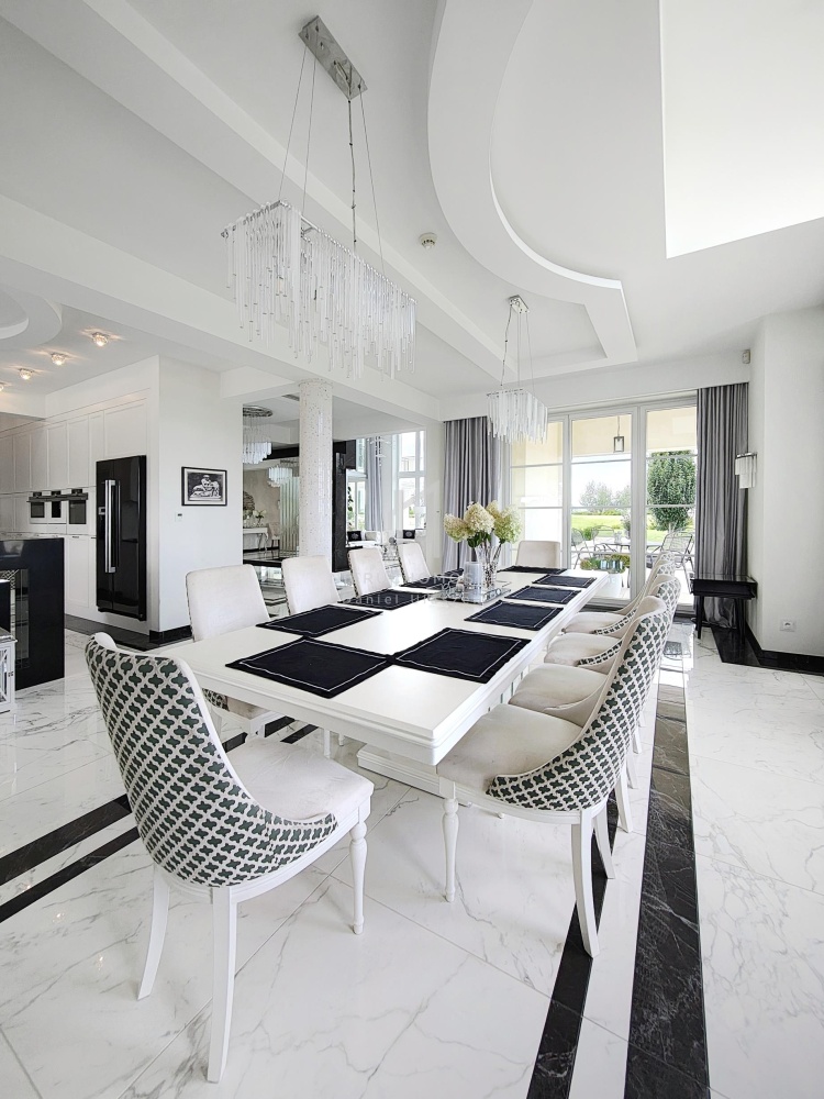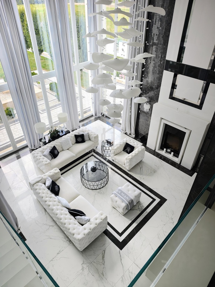 • przestronny salon z kominkiem i imponującym żyrandolem oraz wygodnym kompletem wypoczynkowym z włoskiego weluru, które w połączeniu z wysoką na 6 metry przestrzenią sufitową i panoramicznymi przeszkleniami w stylu francuskim wychodzącymi na ogród i taras – zapewnia niezwykłe doznania wizualne i przestrzenne,