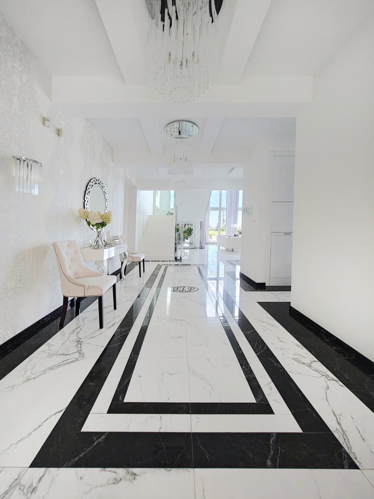 – Wysokiej jakości wykończenia takie jak: naturalny kamień piaskowy na murkach wokół basenu, biały marmur, czarny granit, spiek kwarcowy na schodach, porcelanowe płytki, przeszklenia z filtrem UV;
