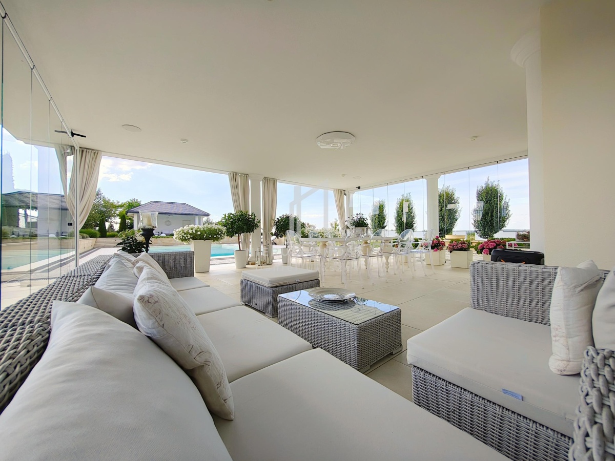 – Przestronny taras ok. 100 m2 w tylnej części willi z bezpośrednim połączeniem z basenem wraz z budynkiem stanowiącym pawilon wypoczynkowy;