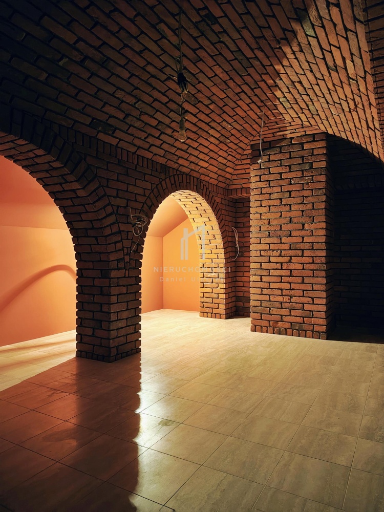 • klimatyczną piwniczkę na wino wykończona cegłą z charakterystycznym łukiem sklepiennym.