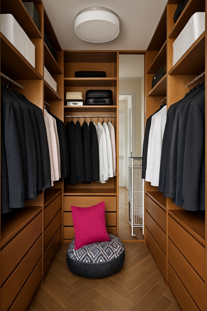 -garderoba 10 m² – aktualnie w układzie master bedroom – wejście bezpośrednio z sypialni, pełni funkcję dużej prywatnej garderoby.