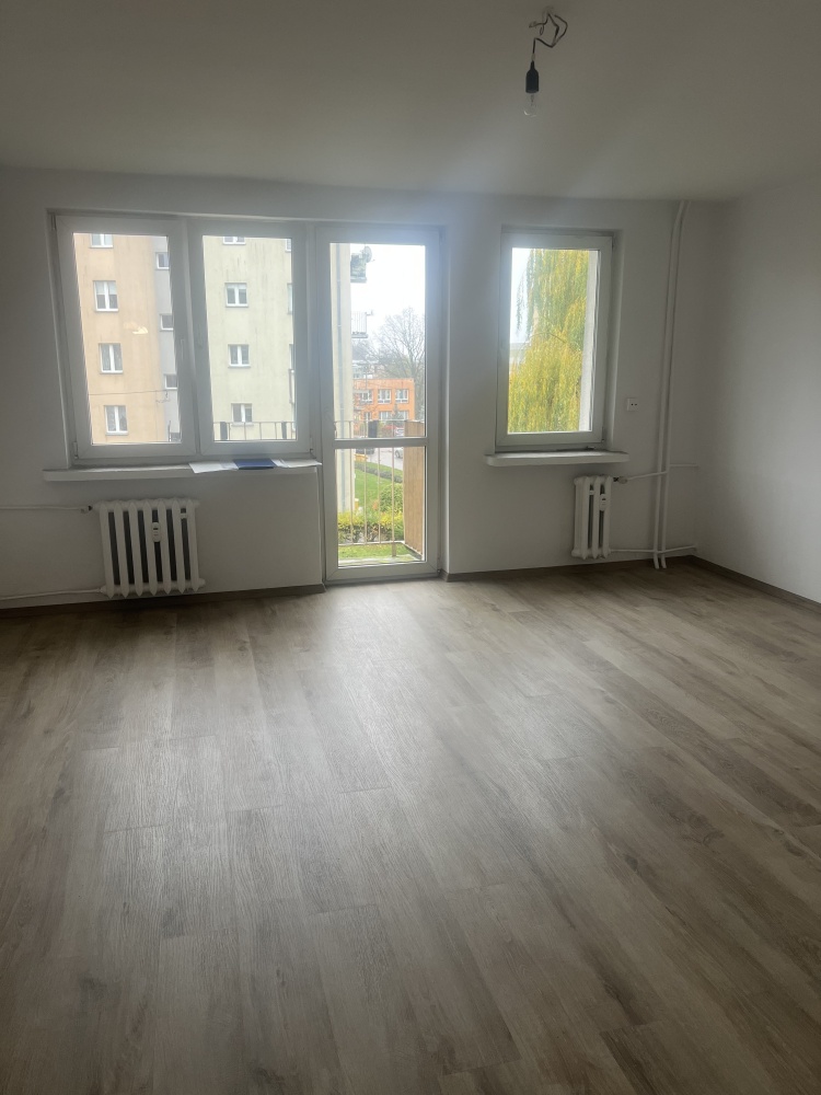 Nieruchomość składa się z dużego salonu z balkonem, 2 pokoi, kuchni, łazienki z WC oraz przedpokoju.