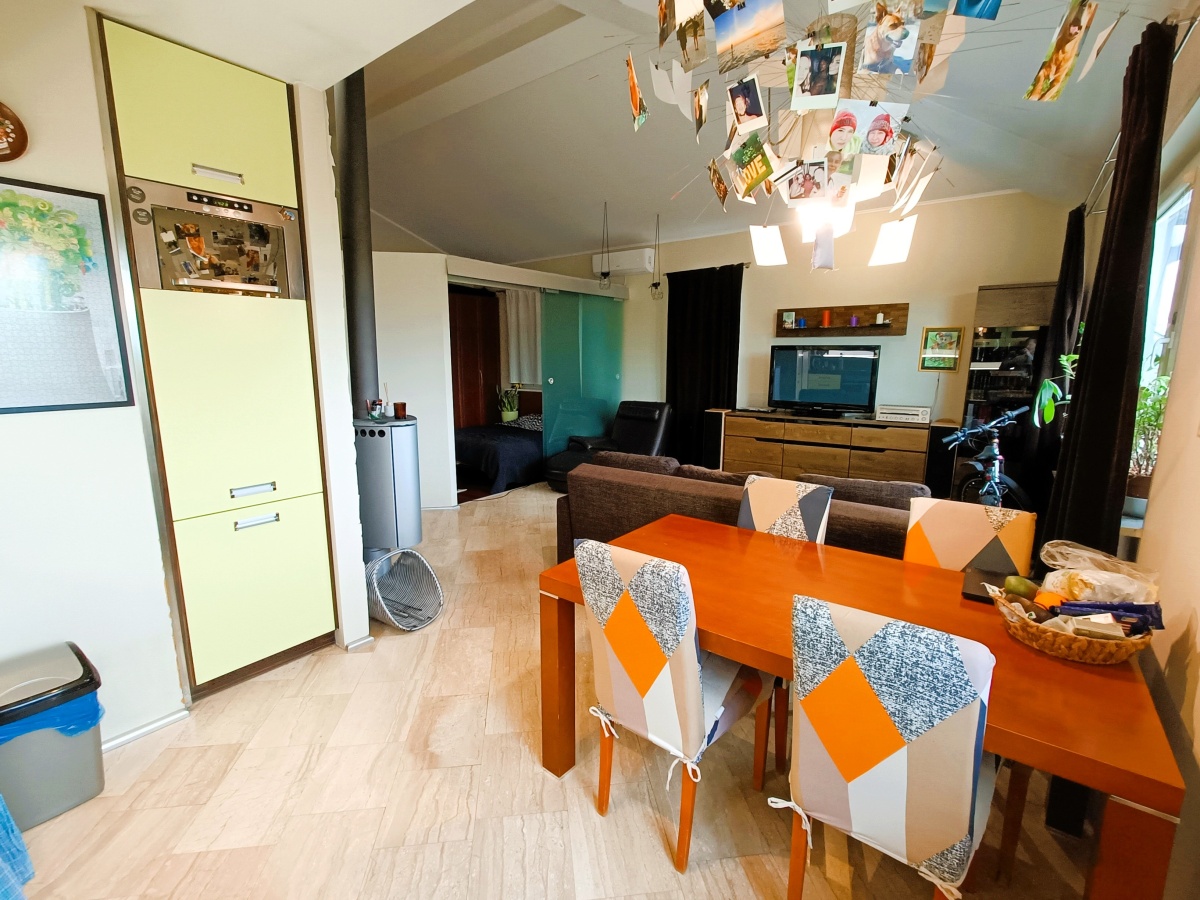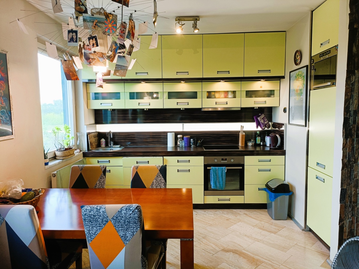 Kuchnia w pełnej zabudowie i wyposażona w sprzęt AGD dobrej klasy. Urządzenia mają już kilkanaście lat ale są absolutnie w dobrej kondycji. W wyposażeniu kuchni są: piekarnik, lodówka, płyta indukcyjna, mikrofalówka, zmywarka.