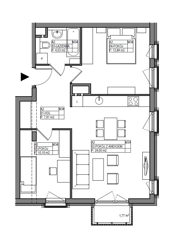 Składa się z następujących pomieszczeń: salon z aneksem kuchennym (24 m²) sypialnia (13,84 m²) sypialnia (10,10 m²) łazienka z wc (4,53 m²) korytarz z dużą szafą (ok. 7,81 m²)