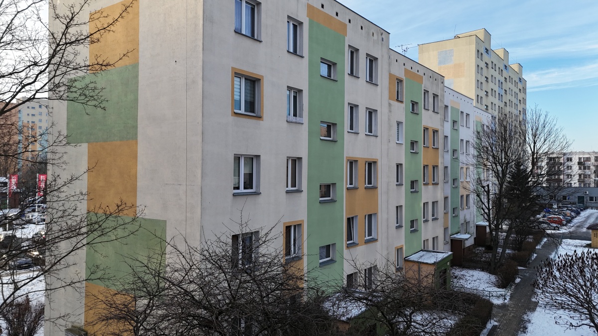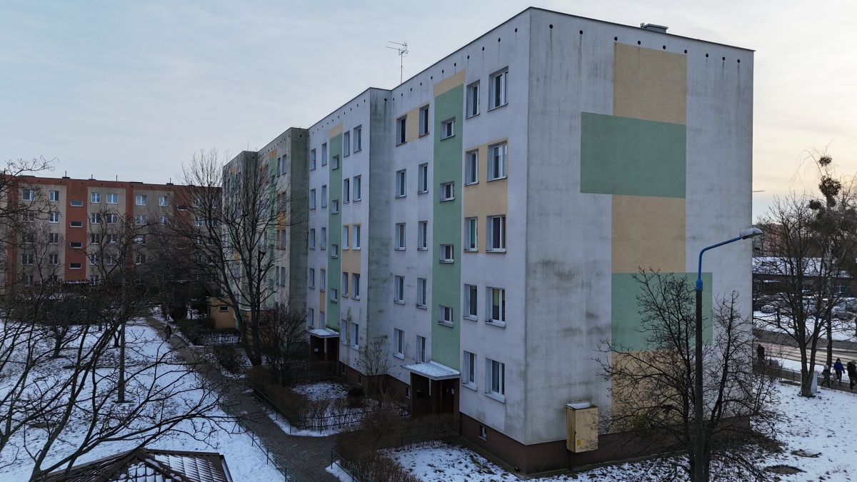 Budynek zbudowany jest z wielkiej płyty. Ocieplony i otynkowany. Posiada miejskie ogrzewanie oraz gaz doprowadzony do kuchenki.