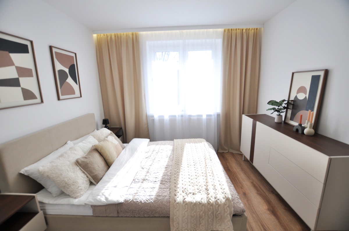 – układ: 2 pokoje — salon z kuchnią + duża sypialnia