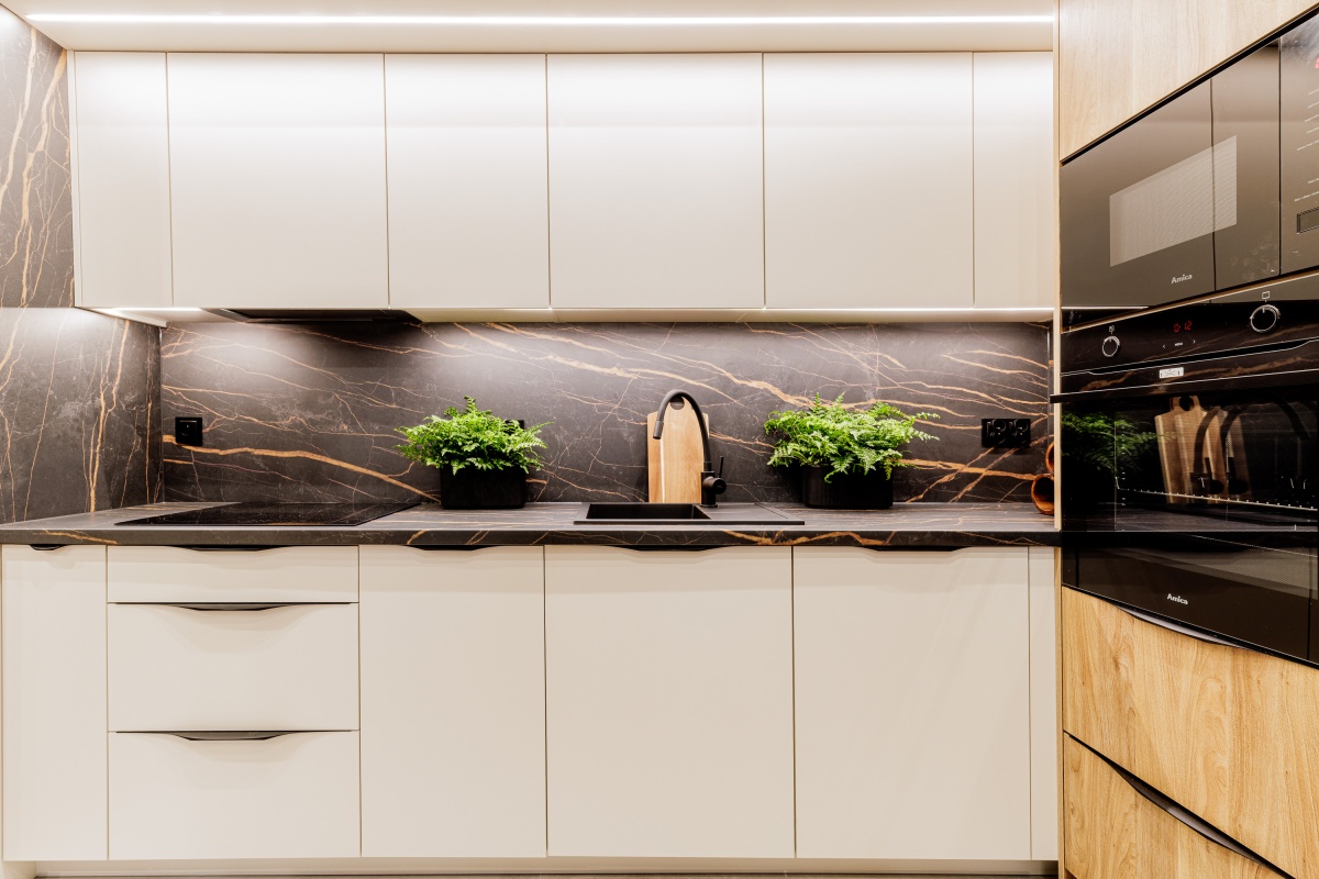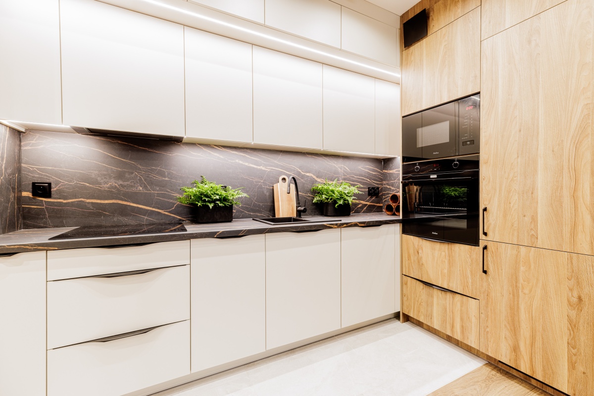 W cenie nowe AGD: płyta indukcyjna, piekarnik oraz mikrofalówka w zabudowie.