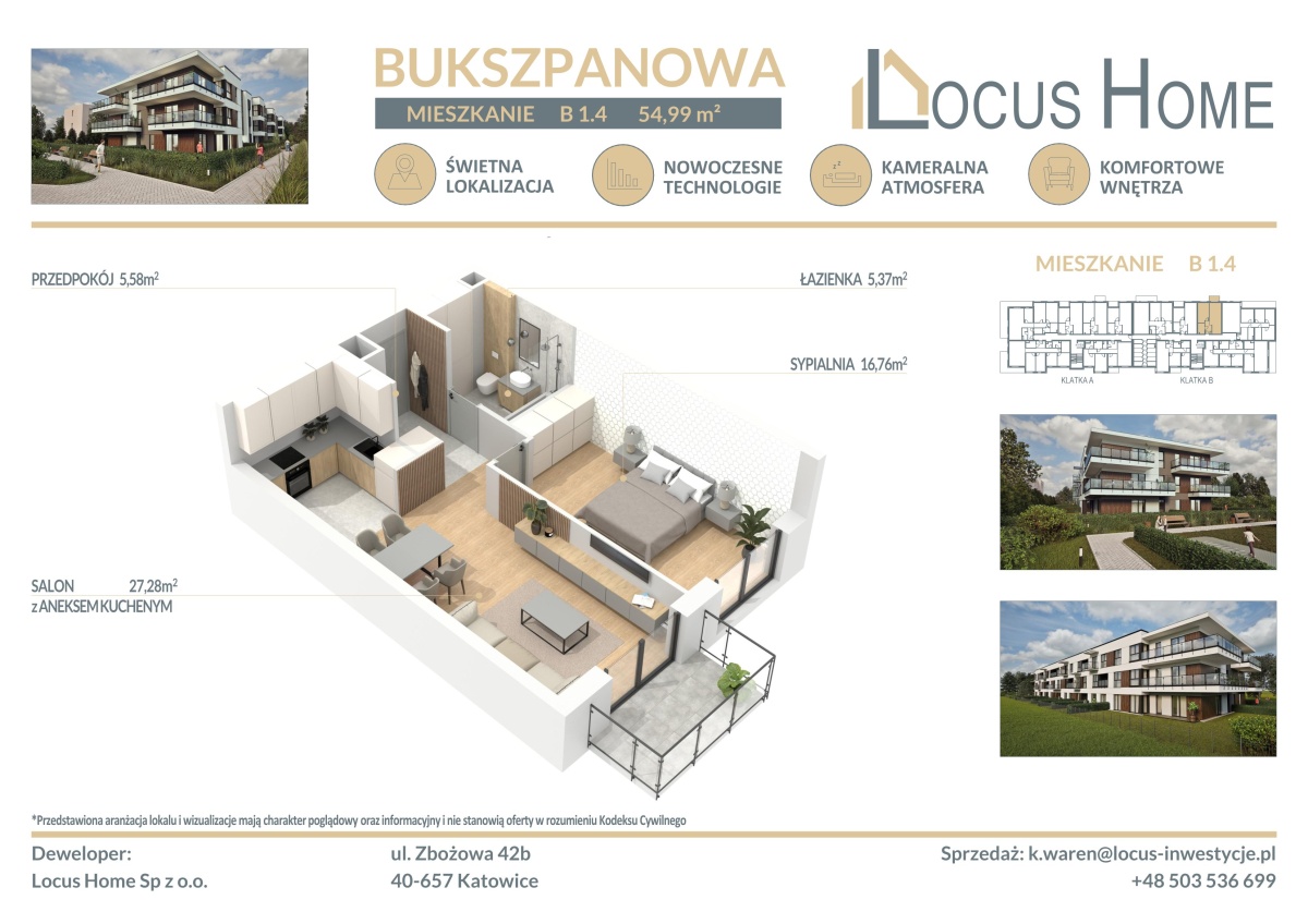 Spółka LOCUS HOME to DEWELOPER który realizuje inwestycje mieszkaniowe na terenie Katowic od wielu lat. NOWA inwestycja na ulicy BUKSZPANOWEJ (obok nr 19) w Piotrowicach to nowoczesny apartamentowiec w doskonałej lokalizacji Katowic.