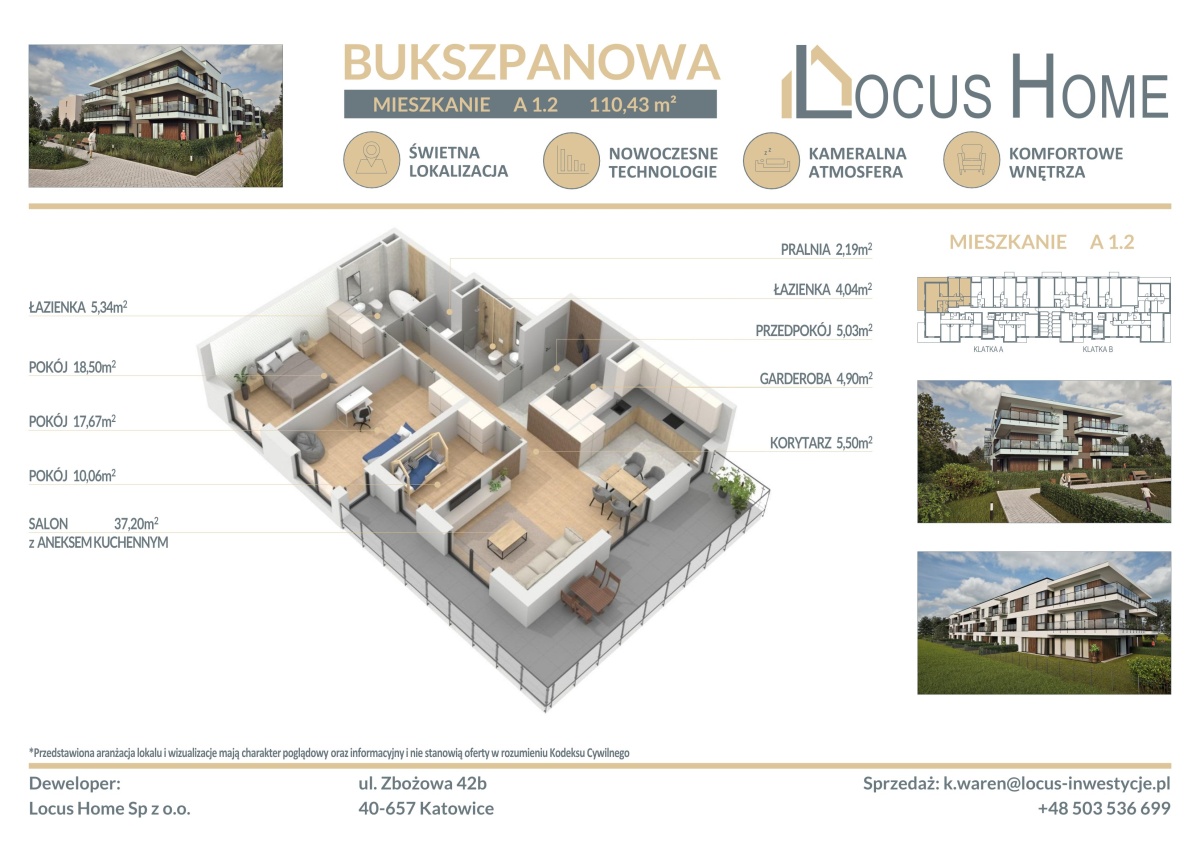 Spółka LOCUS HOME to DEWELOPER który realizuje inwestycje mieszkaniowe na terenie Katowic od wielu lat. NOWA inwestycja na ulicy BUKSZPANOWEJ (obok nr 19) w Piotrowicach to nowoczesny apartamentowiec w doskonałej lokalizacji Katowic.