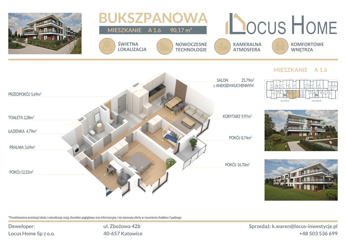 Spółka LOCUS HOME to DEWELOPER który realizuje inwestycje mieszkaniowe na terenie Katowic od wielu lat. NOWA inwestycja na ulicy BUKSZPANOWEJ (obok nr 19) w Piotrowicach to nowoczesny apartamentowiec w doskonałej lokalizacji Katowic.