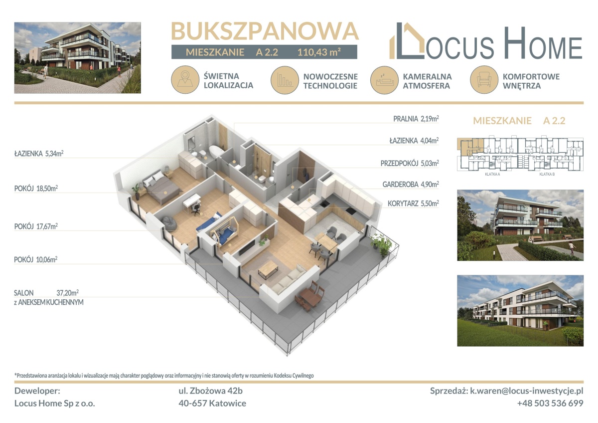 Spółka LOCUS HOME to DEWELOPER który realizuje inwestycje mieszkaniowe na terenie Katowic od wielu lat. NOWA inwestycja na ulicy BUKSZPANOWEJ (obok nr 19) w Piotrowicach to nowoczesny apartamentowiec w doskonałej lokalizacji Katowic.