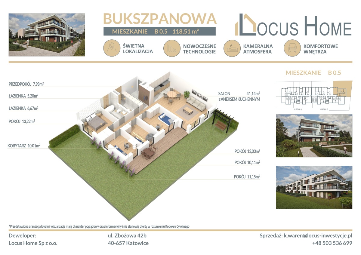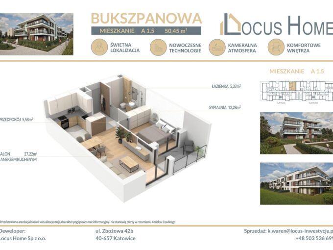 Spółka LOCUS HOME to DEWELOPER który realizuje inwestycje mieszkaniowe na terenie Katowic od wielu lat. NOWA inwestycja na ulicy BUKSZPANOWEJ (obok nr 19) w Piotrowicach to nowoczesny apartamentowiec w doskonałej lokalizacji Katowic.
