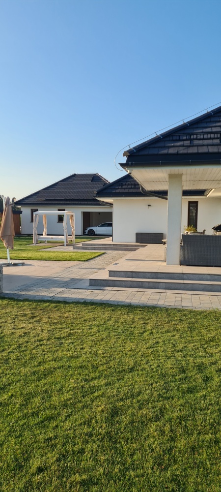 Wysoka jakość wykończenia wnętrz: salon z 3 przesuwnymi oknami prowadzącymi na ogród, przestronna kuchnia, spiżarnia, 4 pokoje, garderoba, łazienka, pralnia, toaleta, szatnia oraz wiatrołap.